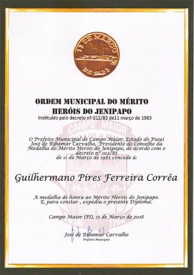 A Prefeitura de Campo Maior divulgou a relação dos homenageados com a Medalha do Mérito Jenipapo, que foram entregues pelo prefeito Professor Ribinha, durante a solenidade cívico-militar em comemoração aos 194 anos da Batalha do Jenipapo, que aconteceu no último dia 13 de março, (quarta-feira). A solenidade aconteceu no monumento aos Heróis do Jenipapo e contou com a presença do governador Wellington Dias.  Dentre os homenageados personalidades civis e militares que prestaram relvantes serviços para Campo Maior, para o Piauí e para o Brasil. O advogado ANTONIO CARLOS DA COSTA E SILVA foi um dos homenageados com esta comenda.As festividades pelos 194º aniversário da Batalha do Jenipapo aconteceu na manhã de quarta-feira, dia 13 de março. A programação iniciou ao meio dia, com Missa em Ação de Graças, na Catedral de Santo Antônio, em Campo Maior. Às 14 h, foi realizado Culto em Ação de Graças na Igreja Batista Nacional Philadelfia, no bairro de Fátima.