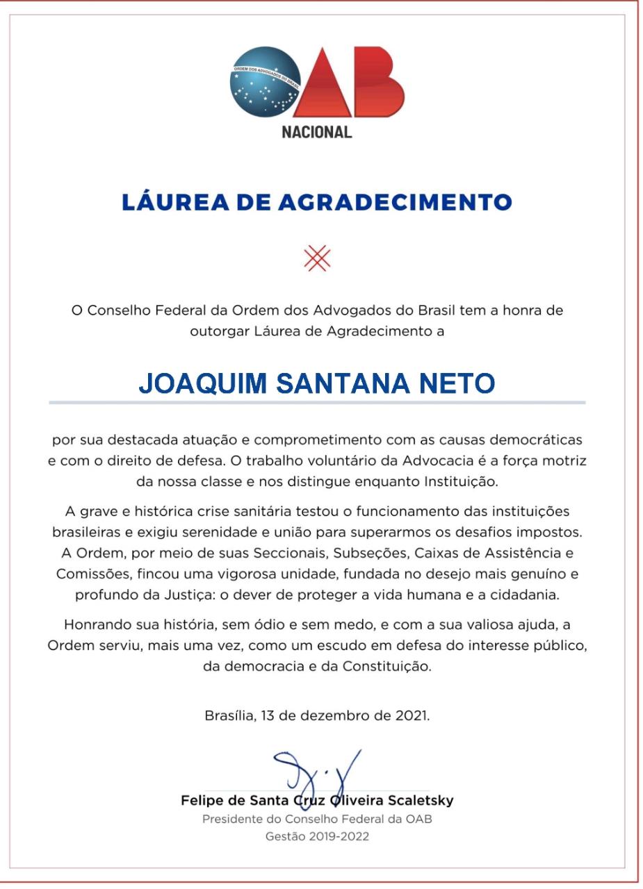 O Advogado Dr. Joaquim Santana Neto, em sua longa trajetória de trabalho, como, Vice Presidente da Comissão Especial dos Direitos das Pessoas com Deficiência nos triênios de 2010/2012 e de 2013/2015, do Conselho Federal da OAB em Brasília