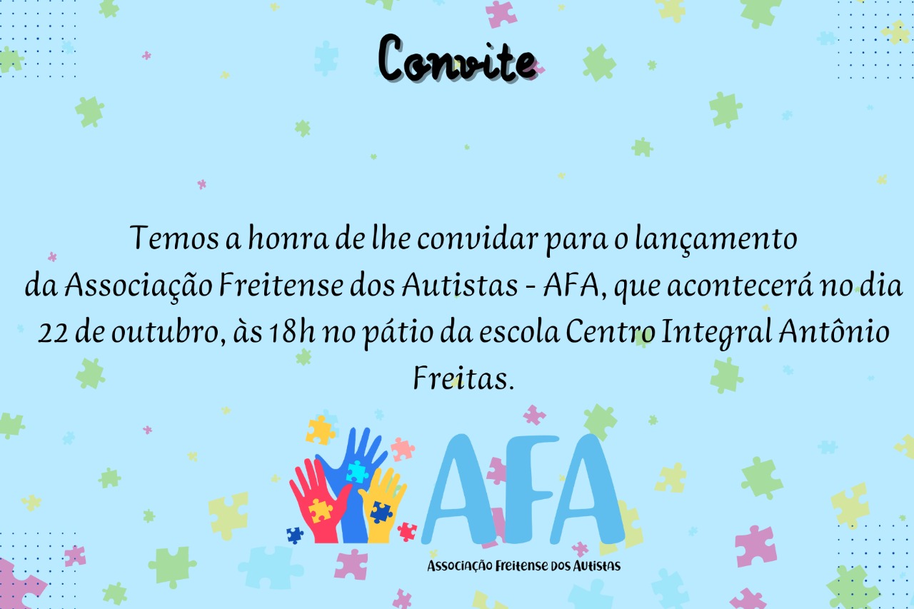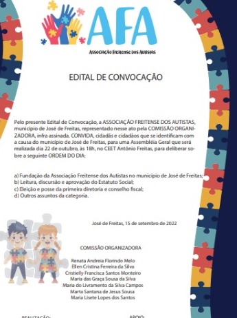 A AFA-Associação Freitense dos Autistas convoca a sociedade de um modo geral para o lançamento da associação ao tempo em que apresenta o Edital de Convocação: A ASSOCIAÇÃO FREITENSE DOS AUTISTAS, município de José de Freitas, representado nesse ato pela COMISSÃO ORGANIZADORA, infra assinada. CONVIDA, cidadãs e cidadãos que se identificam com a causa do município de José de Freitas, para uma Assembléia Geral que será realizada dia 22 de outubro, às 18h, no CEET Antônio Freitas, para deliberar sobre a seguinte ORDEM DO DIA: