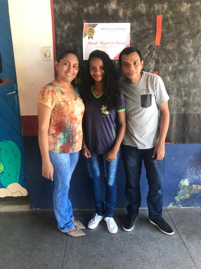 Sarah Raquel de Oliveira Costa aluna da Escola Municipal Agripina Portela, 9º B tem 15 anos, reside na Vila São Francisco na cidade de José de Freitas-PI. Filha de Maria de Fátima de Oliveira Costa e Francisco Carlos de Oliveira, desde o primeiro ano que estuda na Escola Municipal Agripina Portela, este ano participou da Olimpíada Nacional de Ciências e conseguiu classificação na primeira e segunda fase recebendo assim medalha de menção honrosa da organização da ONC.