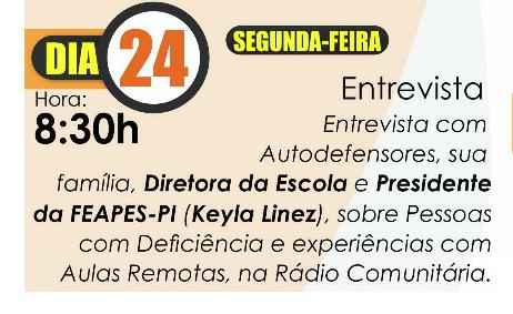 A Presidente da Federação das Apaes do Estado do Piauí-FEAPAE, Keyla Linez Santana comandou o Programa de Rádio Apae é Noticia, com a participação dos auto-defensores e seus familiares, que falaram um pouco de sua historia de vida. A diretora da Escola Especial Corina Freitas-Desterro Andrade acompanhou a todos e teve sua participação no programa.