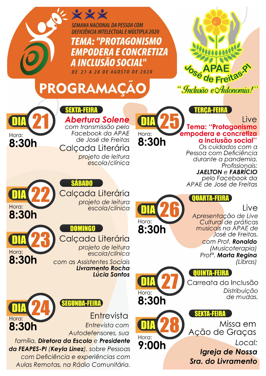 Embora com a questão da pandemia e o distanciamento social. A APAE de José de Freitas organizou a sua programação dentro da “Semana Nacional da Pessoa com Deficiência Intelectual e Múltipla”.Dentro da semana foi trabalhado o “Projeto Calçada Literária”, o qual foi idealizado pela Coordenadora Pedagoga Lucely Andrade para ser aplicado nas residências dos alunos por conta do distanciamento social.
