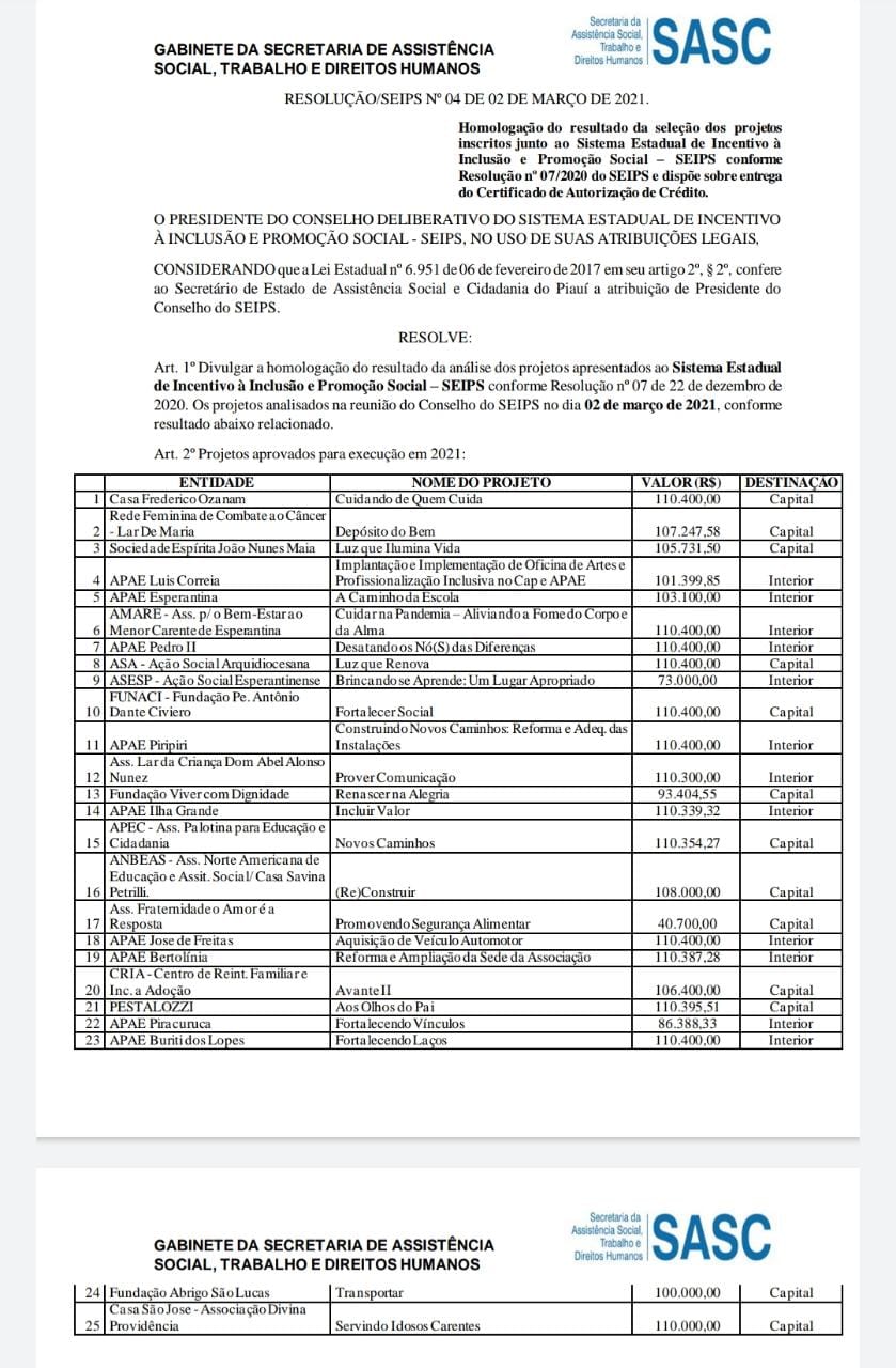 O Presidente do Conselho Deliberativo do Sistema Estadual de Incentivo à Inclusão e Promoção Social-SEIPS, no uso de suas atribuições legais divulgou a homologação do resultado da análise dos projetos apresentados ao Sistema Estadual de Incentivo à Inclusão e Promoção Social dia 2 de março de 2021 de acordo com a resolução Nº 07 de 22 de dezembro de 2020.