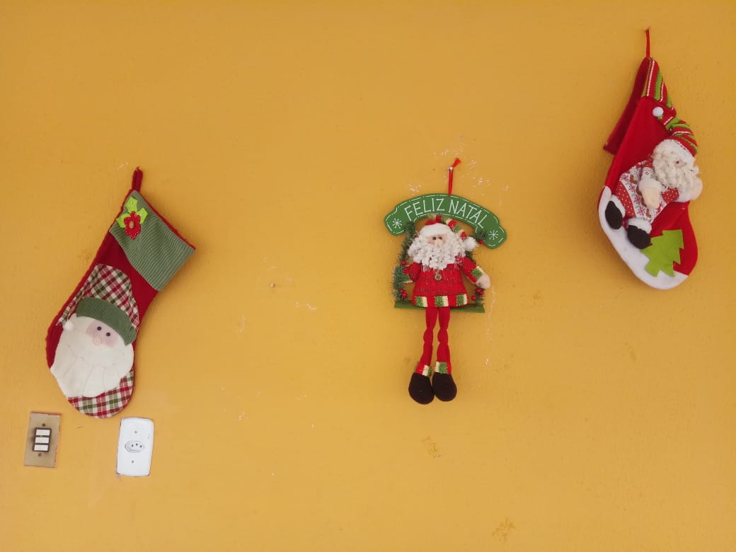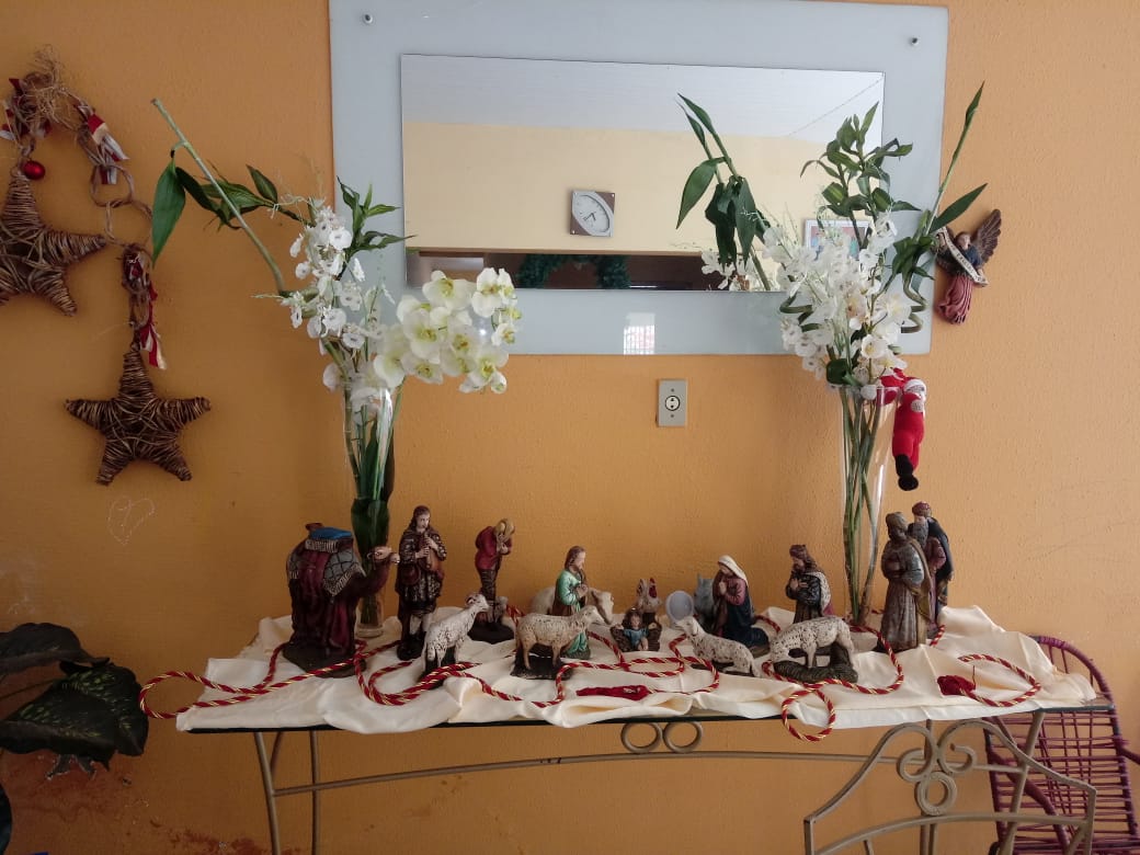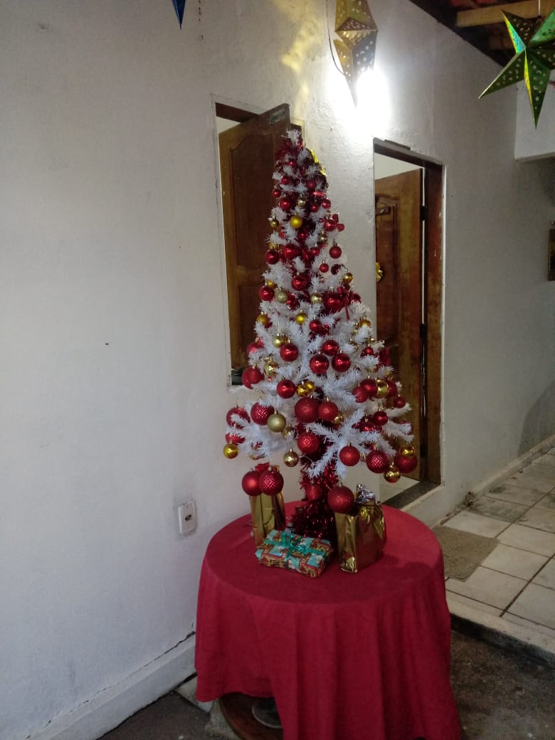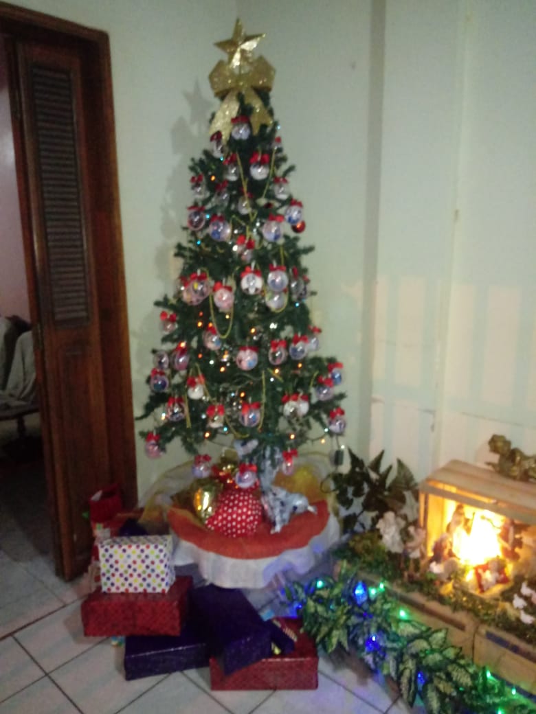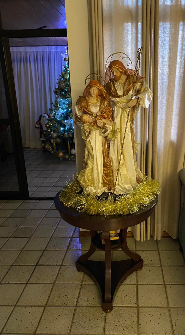 A casa fica toda arrumada com tema de natal, presépio, imagens e a linda árvore de natal, tudo para uma grande festa em família.