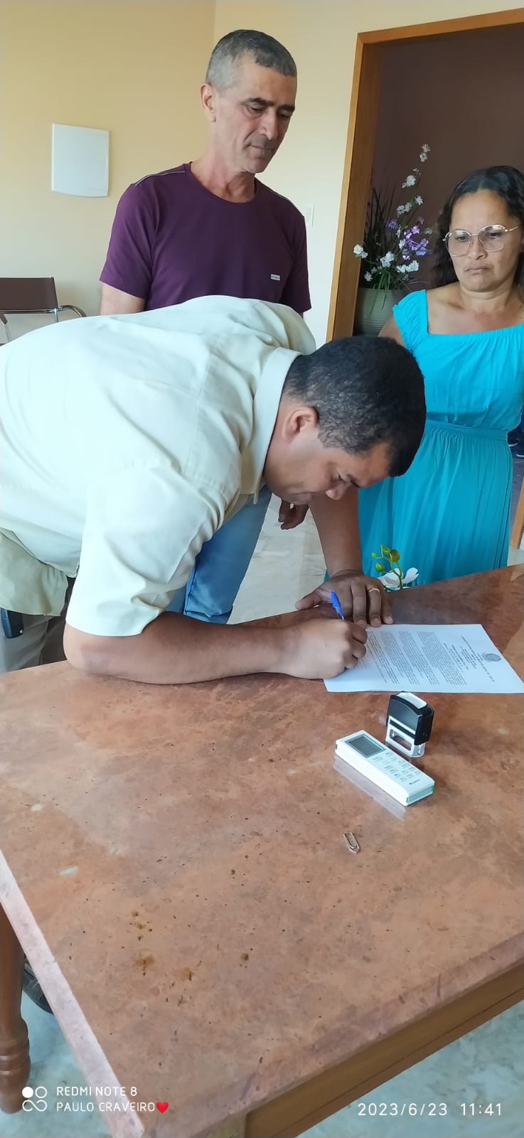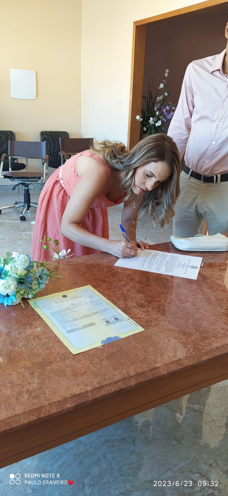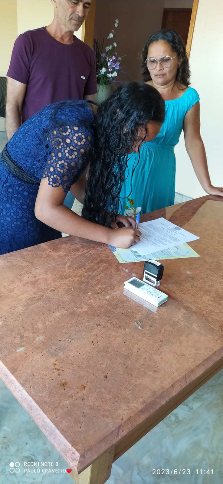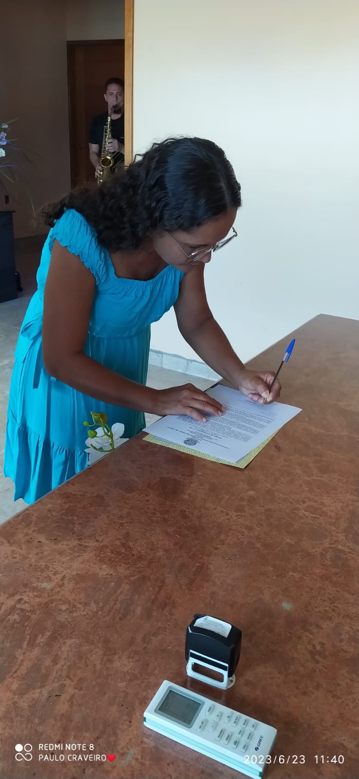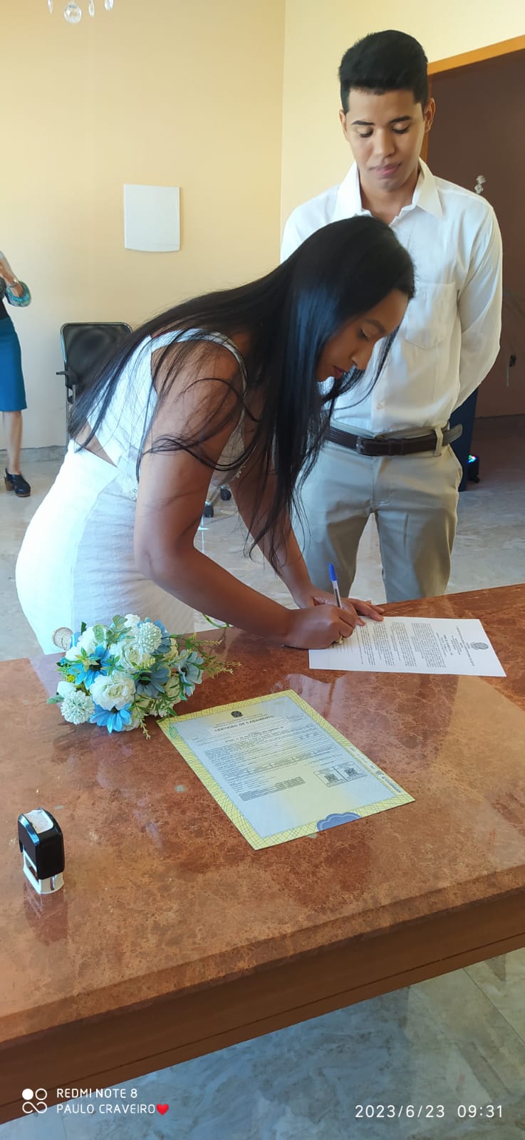Após as assinaturas dos recém casados os padrinhos presentes assinaram o documento de Registro de Casamento, padrinhos: Pricila Cunha Silva e Anderson Nascimento Silva em seguida pelo Registrador Substituto do Cartório Feitosa, Lord Feitosa Neto.