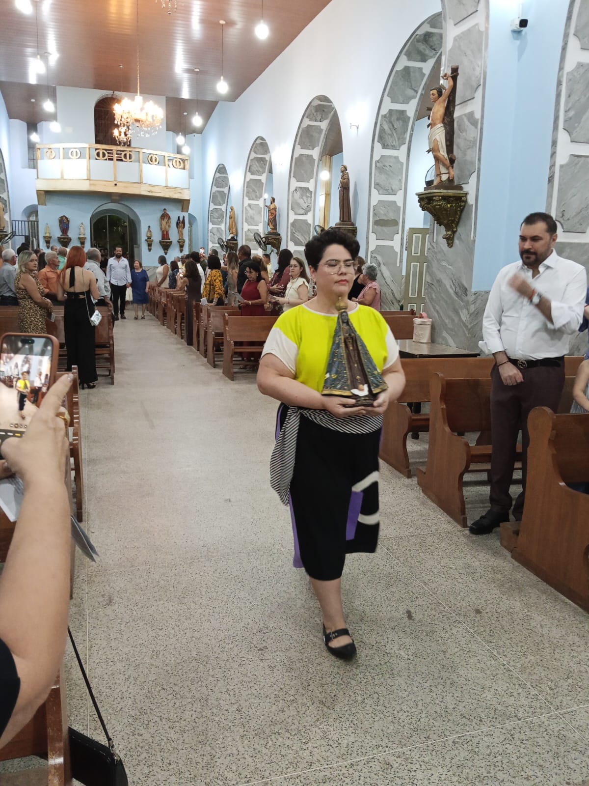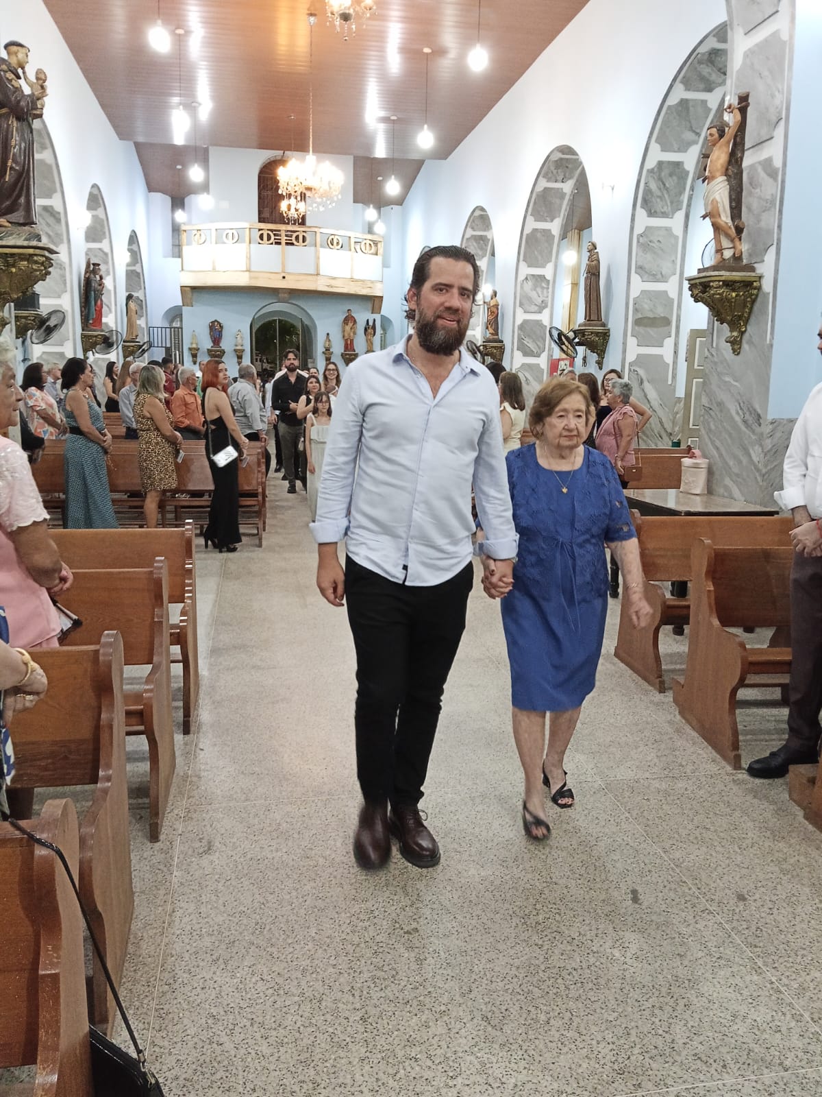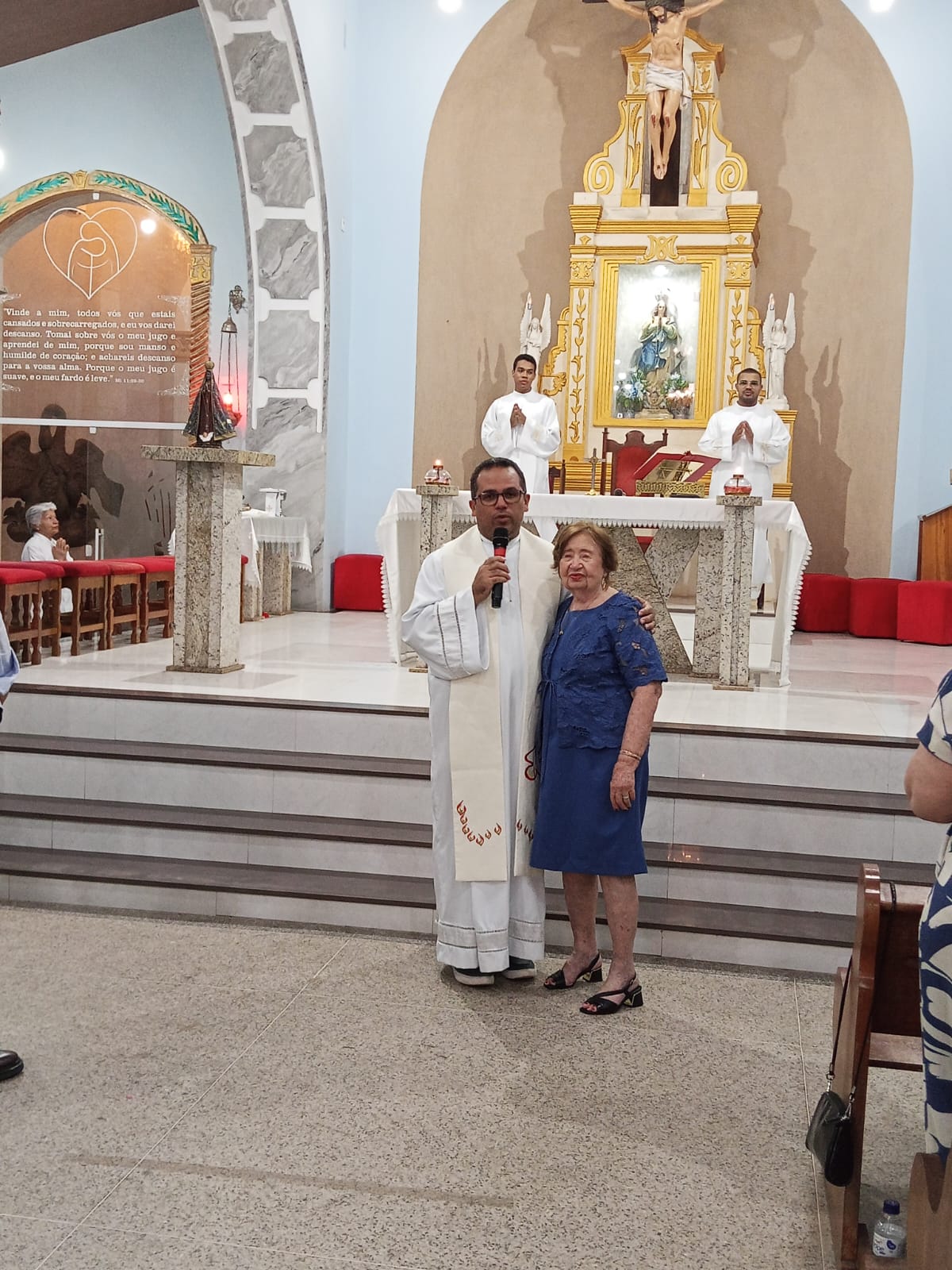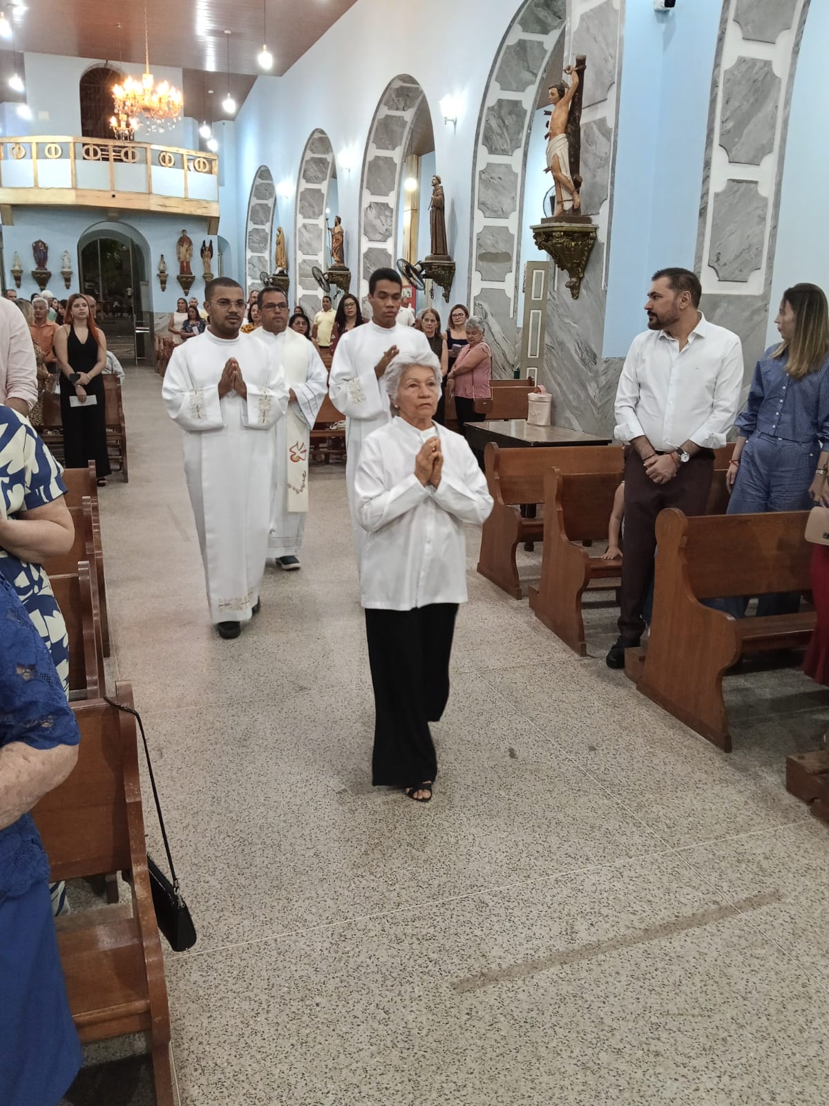 Logo no inicio da missa houve uma procissão de entrada da aniversariante com familiares e a imagem de Nossa Senhora Aparecida. Ela ao lado do neto Iran e a imagem conduzida pela neta.