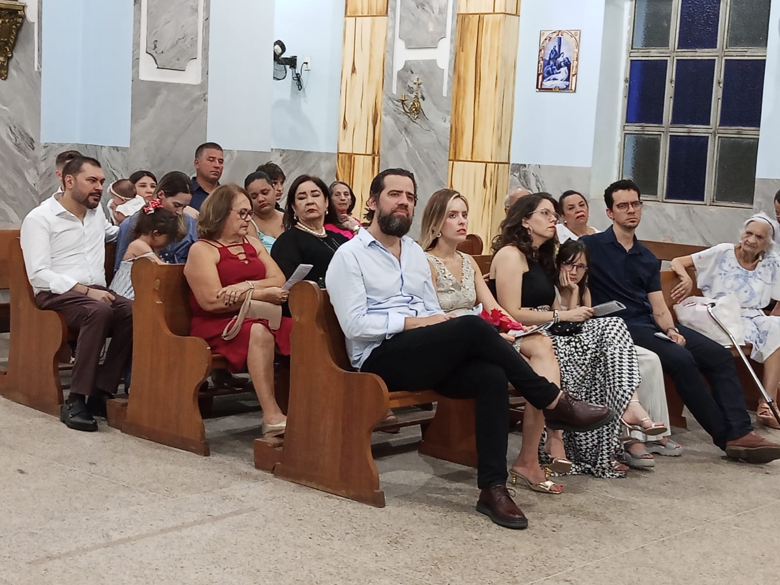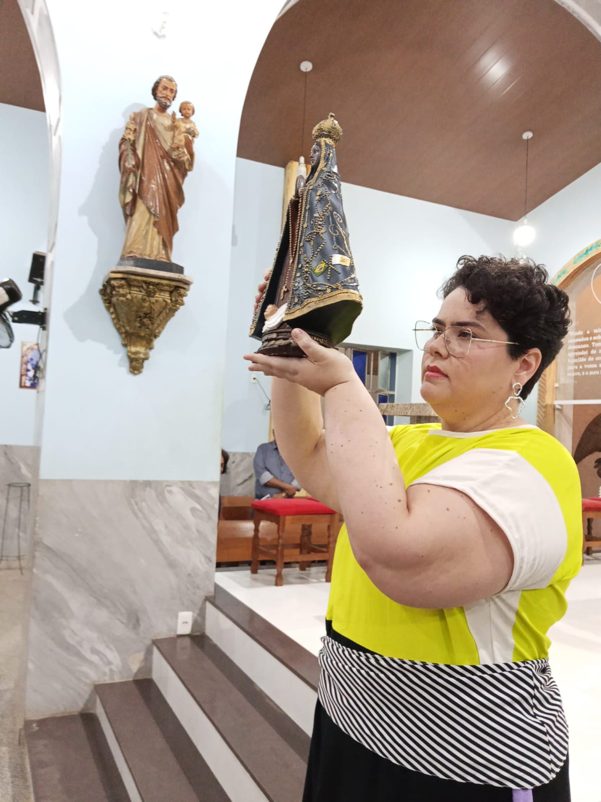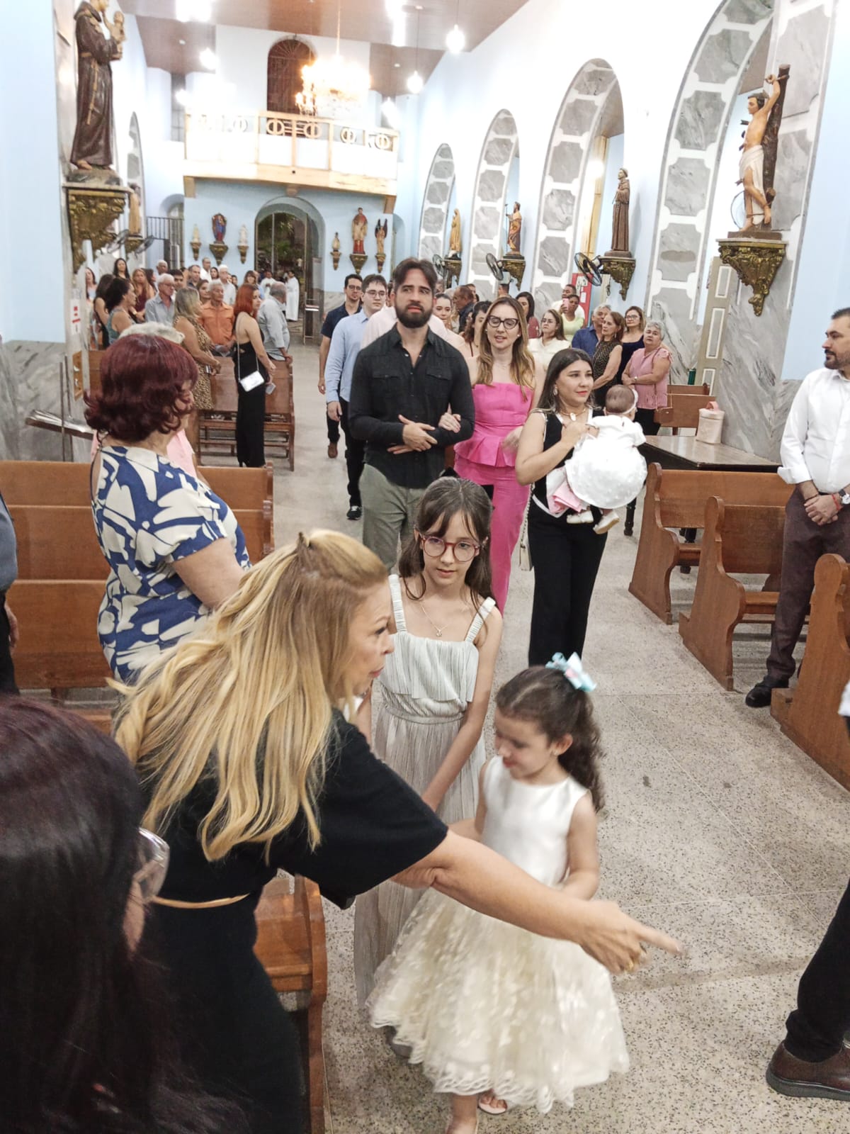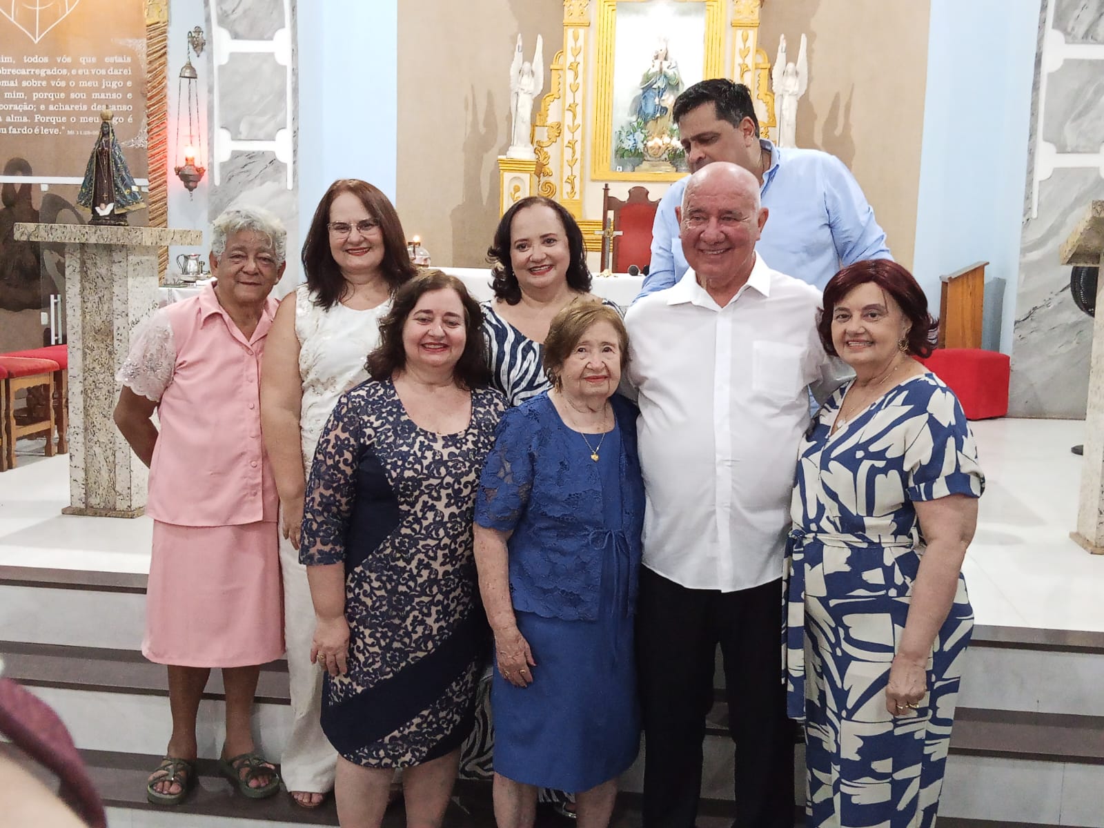 Logo no inicio da missa houve uma procissão de entrada da aniversariante com familiares e a imagem de Nossa Senhora Aparecida. Ela ao lado do neto Iran e a imagem conduzida pela neta.