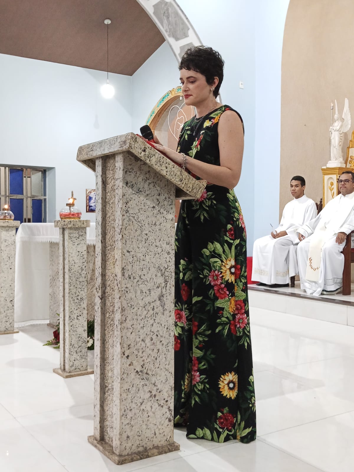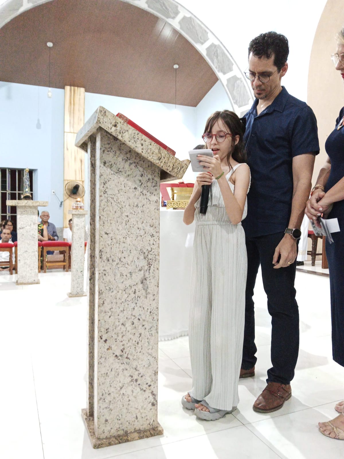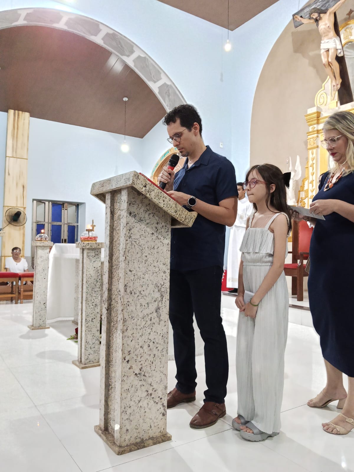Padre Francisco José fez a leitura do Evangelho de Jesus Cristo segundo Lucas (13,22-30). As leitura anteriores , foram feitas, a primeira leitura pela filha Miriam e a segunda leitura pela nora Linda.