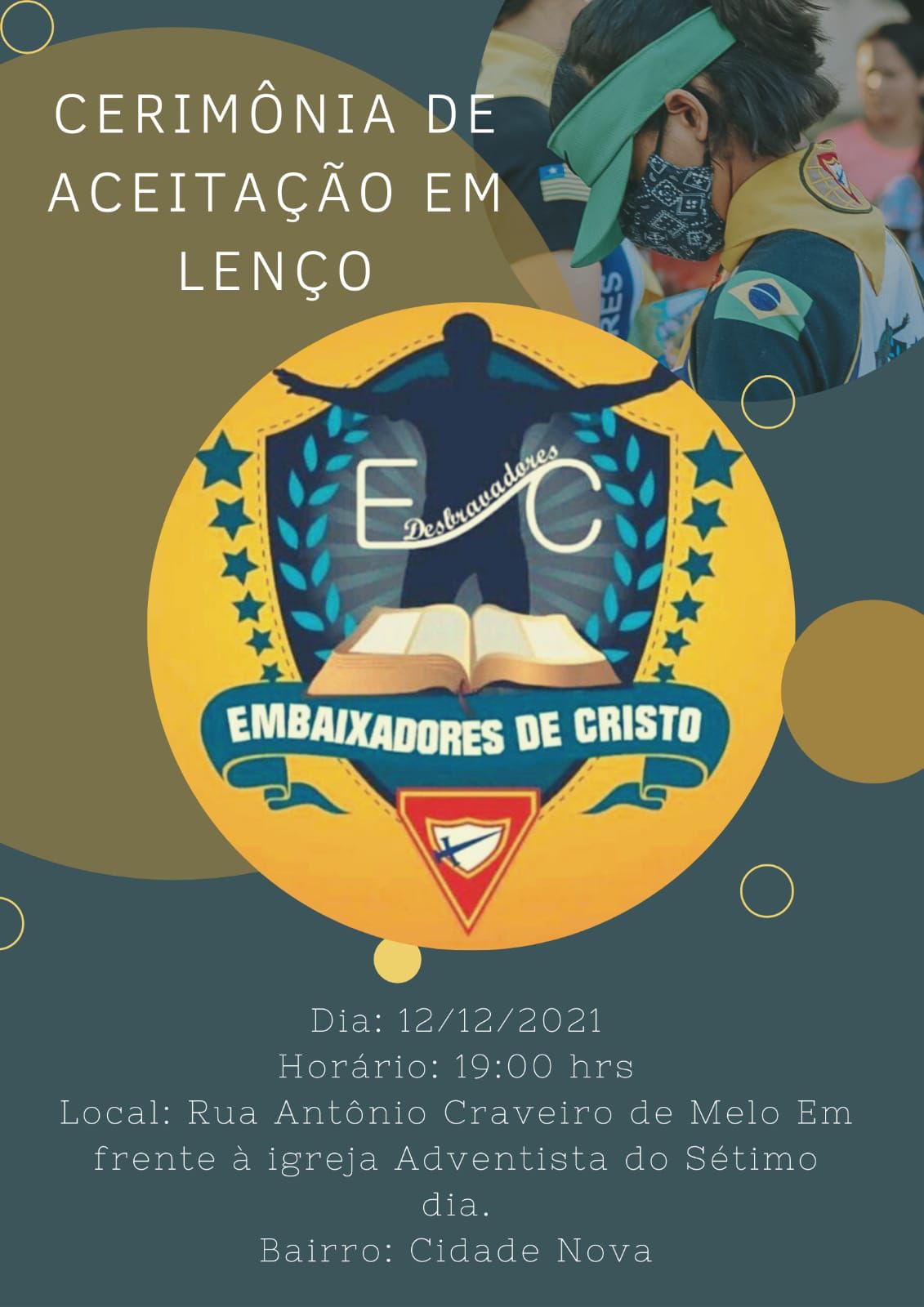 A Igreja Adventista do Sétimo Dia do Bairro Cidade Nova, através do Clube de Desbravadores Embaixadores de Cristo Realizou neste último domingo dia 12 de dezembro de 2021 uma grande Cerimônia de Investidura, de aceitação em lenço.