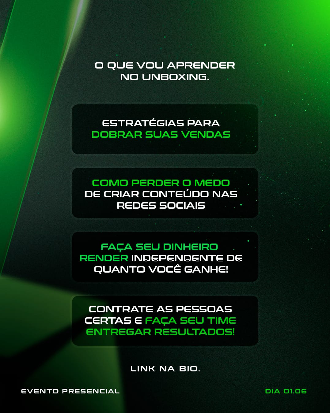Empreendedor(a), o UNBOXING é uma equipe de pessoas que sabem como não é simples fazer um negócio crescer. É uma jornada árdua, cheia de altos e baixos, desafios e incertezas. Mas esta equipe tem a solução para seus problemas, você não precisa enfrentar isso sozinho. Existe um caminho mais fácil, uma estrada pavimentada com conhecimento e ideias valiosos. E é isso que nossa imersão pode te oferecer.