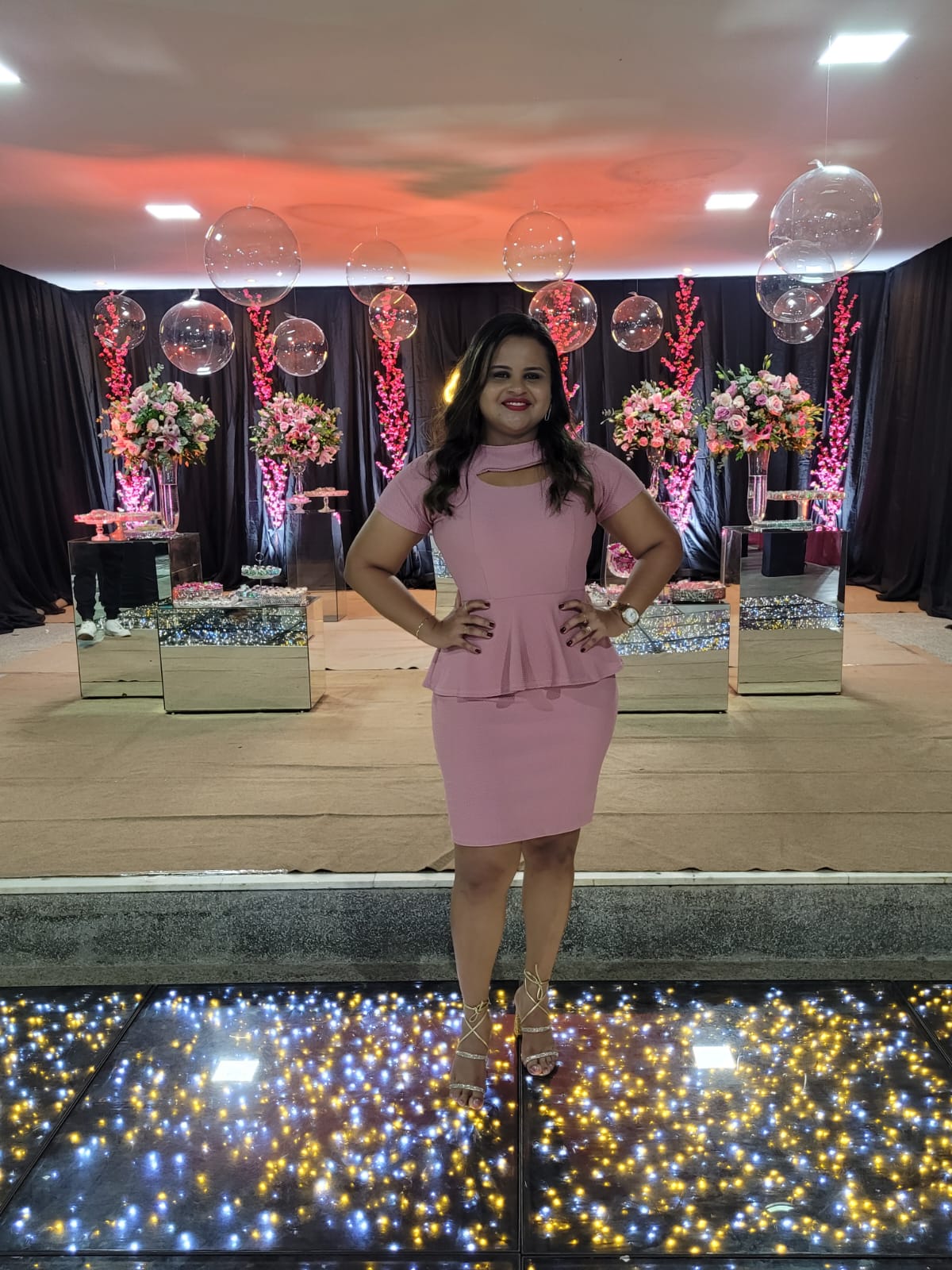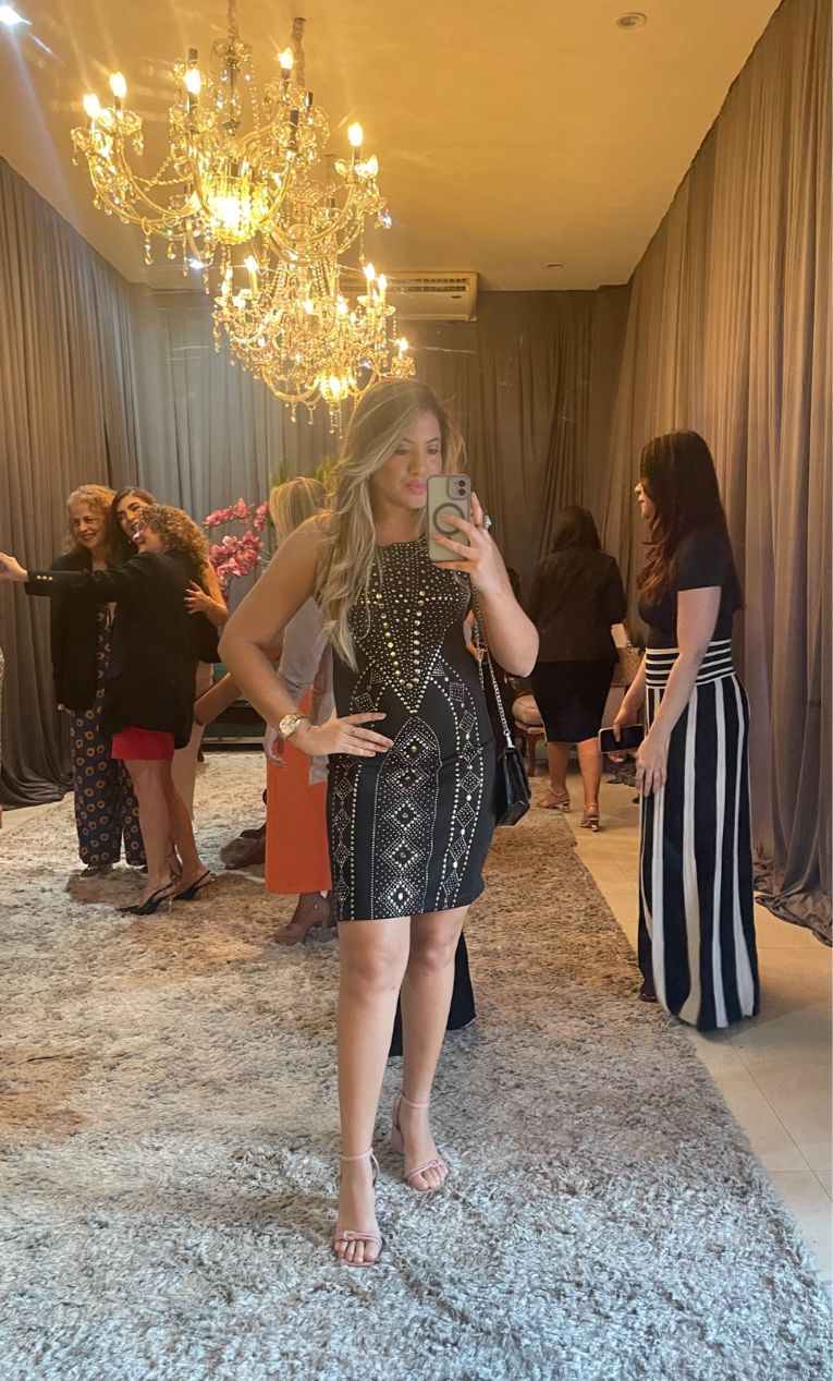 Lurdyanne está usando um look muito especial, um vestido nude com caimento impecável, ideal para a noite e para uma festa tão marcante como os 15 anos de sua sobrinha. A cor clássica trouxe equilíbrio e requinte, valorizando a produção com sutileza.