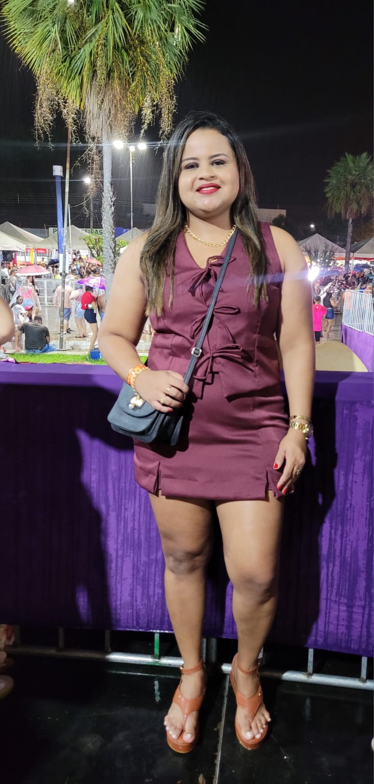 Lurdyanne usa um look vinho formado por saia e blusa, criando uma produção harmoniosa e marcante para o pré-Carnaval. A tonalidade profunda trouxe elegância, enquanto o modelo leve garantiu conforto para aproveitar cada momento da folia. Em sua elegância ela produz a própria moda através da Aslu-Roupas & Acessorios.