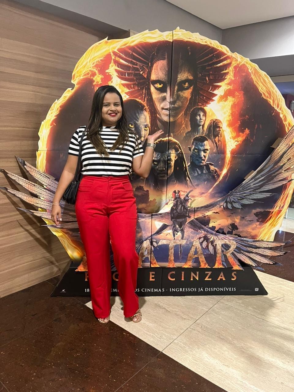 Neste post Lurdyanne usa uma calça vermelha como destaque do look, transmitindo confiança e alegria, combinada com blusa branca de listras que trouxe um ar clássico e atemporal. Uma escolha confortável e estilosa para curtir o shopping e celebrar a estreia de seu filme favorito com muito entusiasmo.
