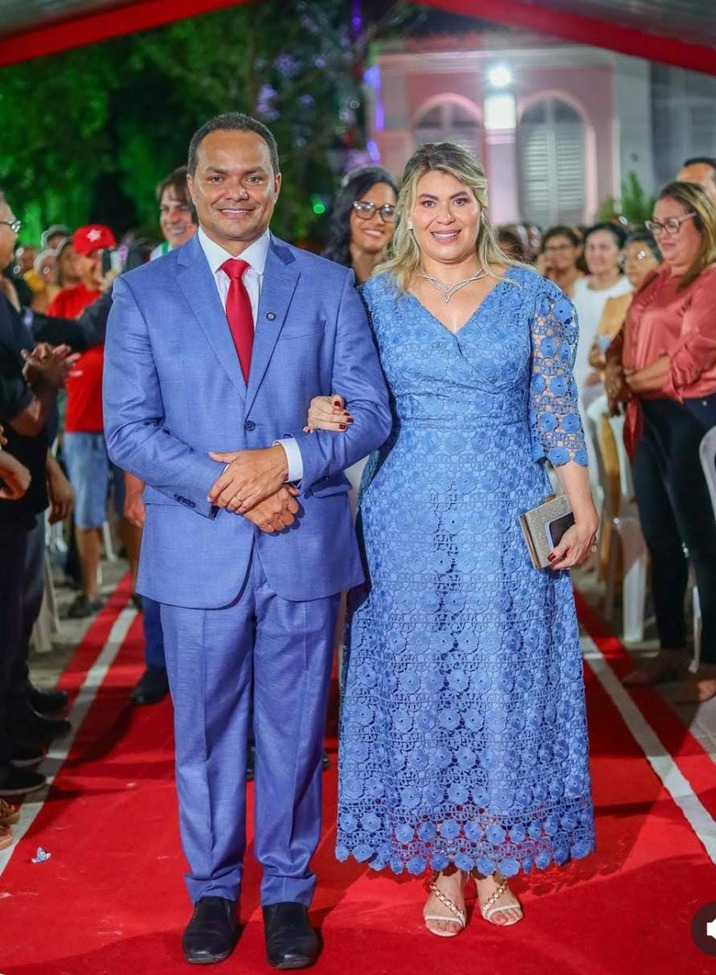 O look que esta usando foi confeccionado especialmente para a posse do marido,o Prefeito Pedro Gomes, a cor um azul de encantar a combinar com o look do esposo.