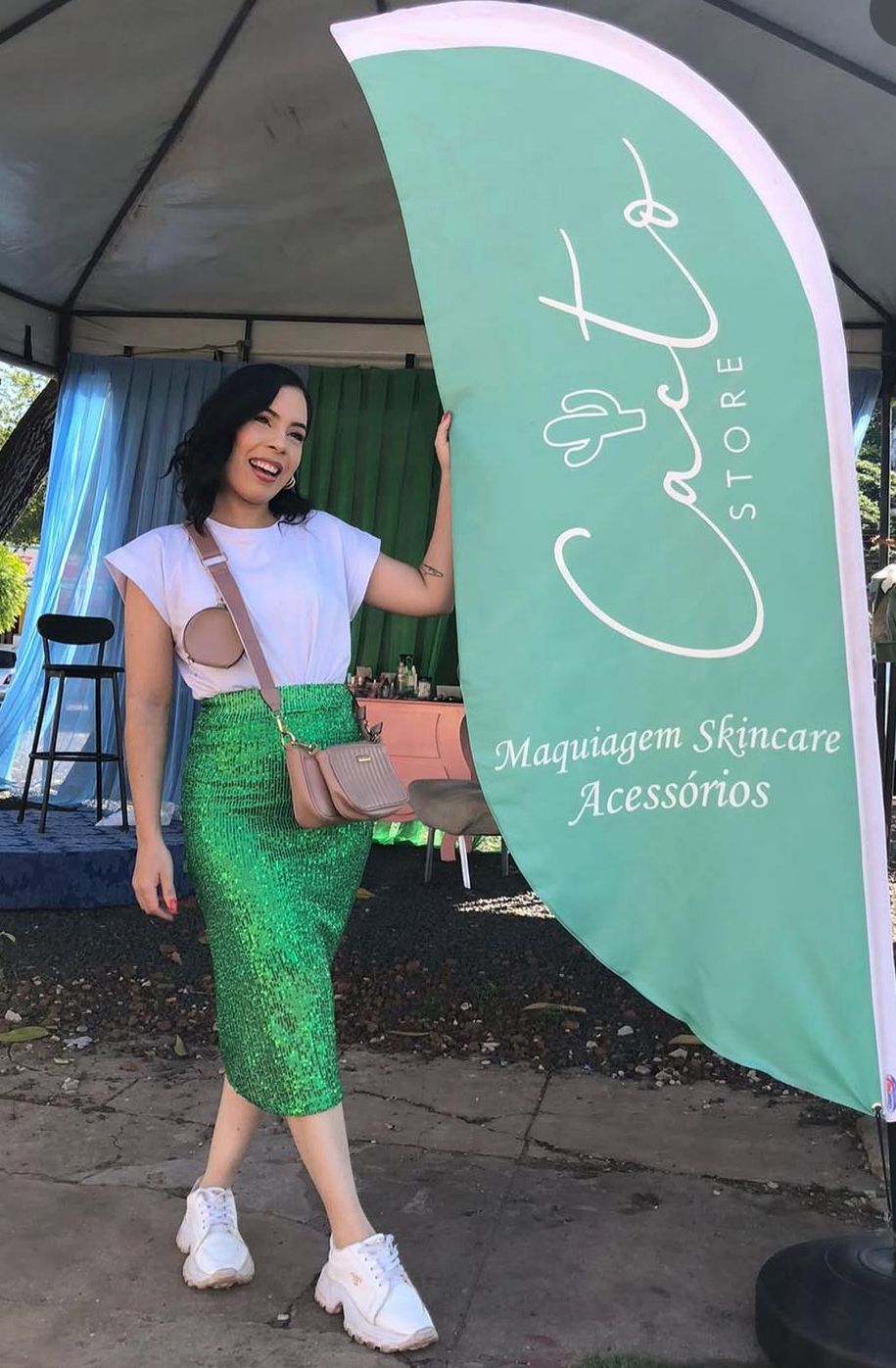 Bruna participa de eventos culturais, onde procura contribuir com o social e cultural, além de divulgar sua marca. Aqui ela usa um look casual esportivo chic para um evento diurno.