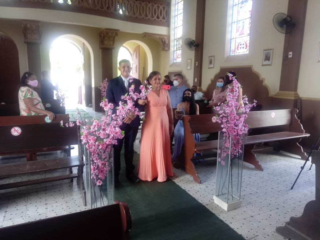 O noivo Romério Rocha adentrou a igreja acompanhado de sua mãe Francisca das Chagas, chamada carinhosamente de Chaguinha.