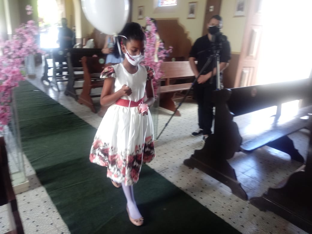 A noiva Alessandra Araujo chegou acompanhada de seu pai Sr. João Araujo, que a conduziu até o altar.