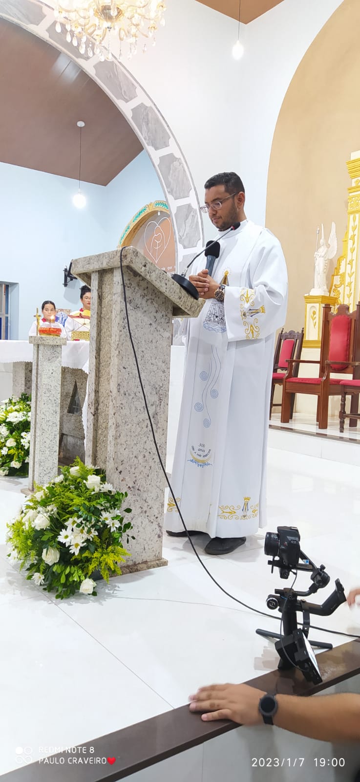 Padre Gilcimar proferiu o Evangelho de Lc, onde na homilia falou sobre o matrimonio e sua diferenciação com o casamento, onde os noivos estavam seguindo a forma correta dos mandamentos da igreja.