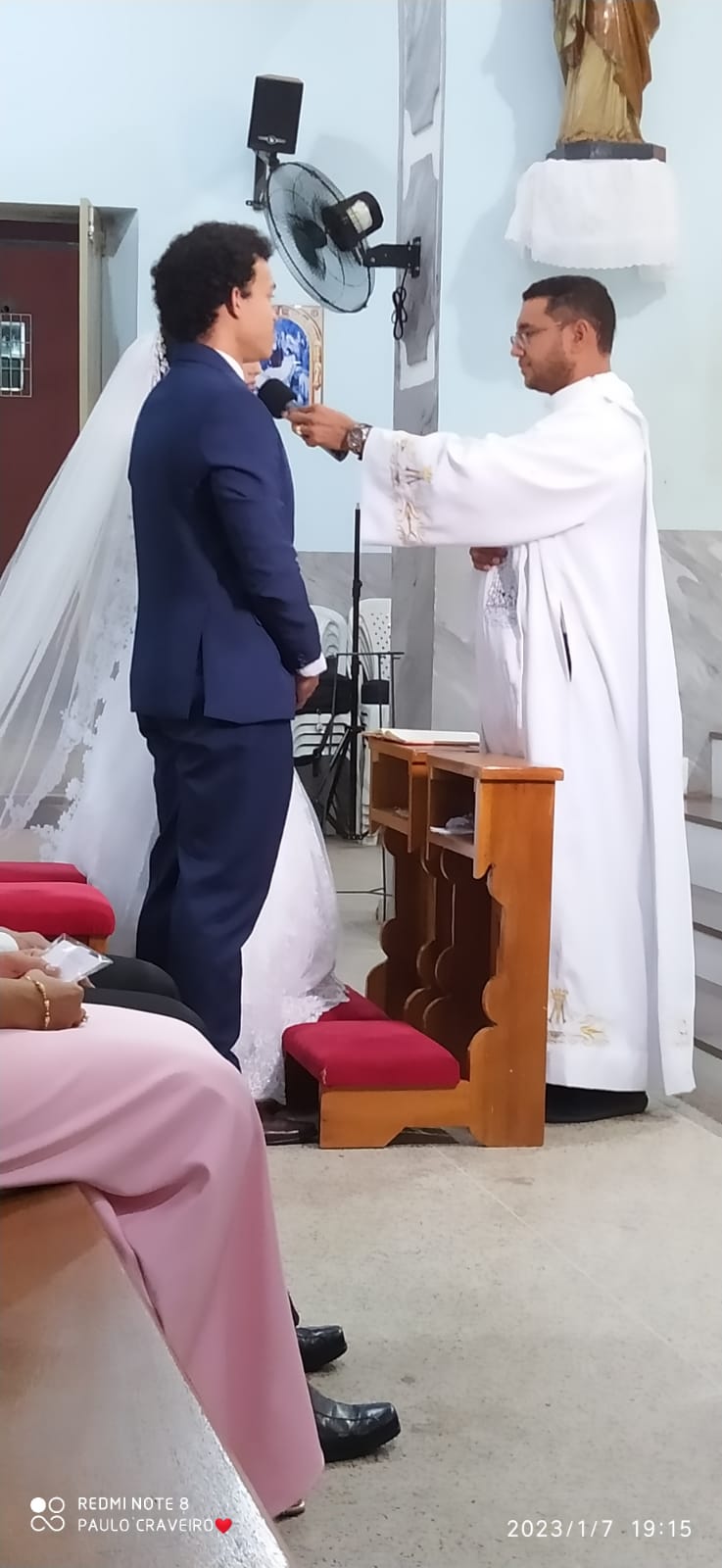 A palavra do Senhor orienta ilumina nossos passos. Deus nos criou para sermos felizes e nos aponta o caminho da felicidade:  O amor sem limites! Só assim os casais podem construir um lar firme e duradouro. Todos ouviram atentamente a primeira leitura que foi lida pela tia da noiva Lucia Craveiro.
