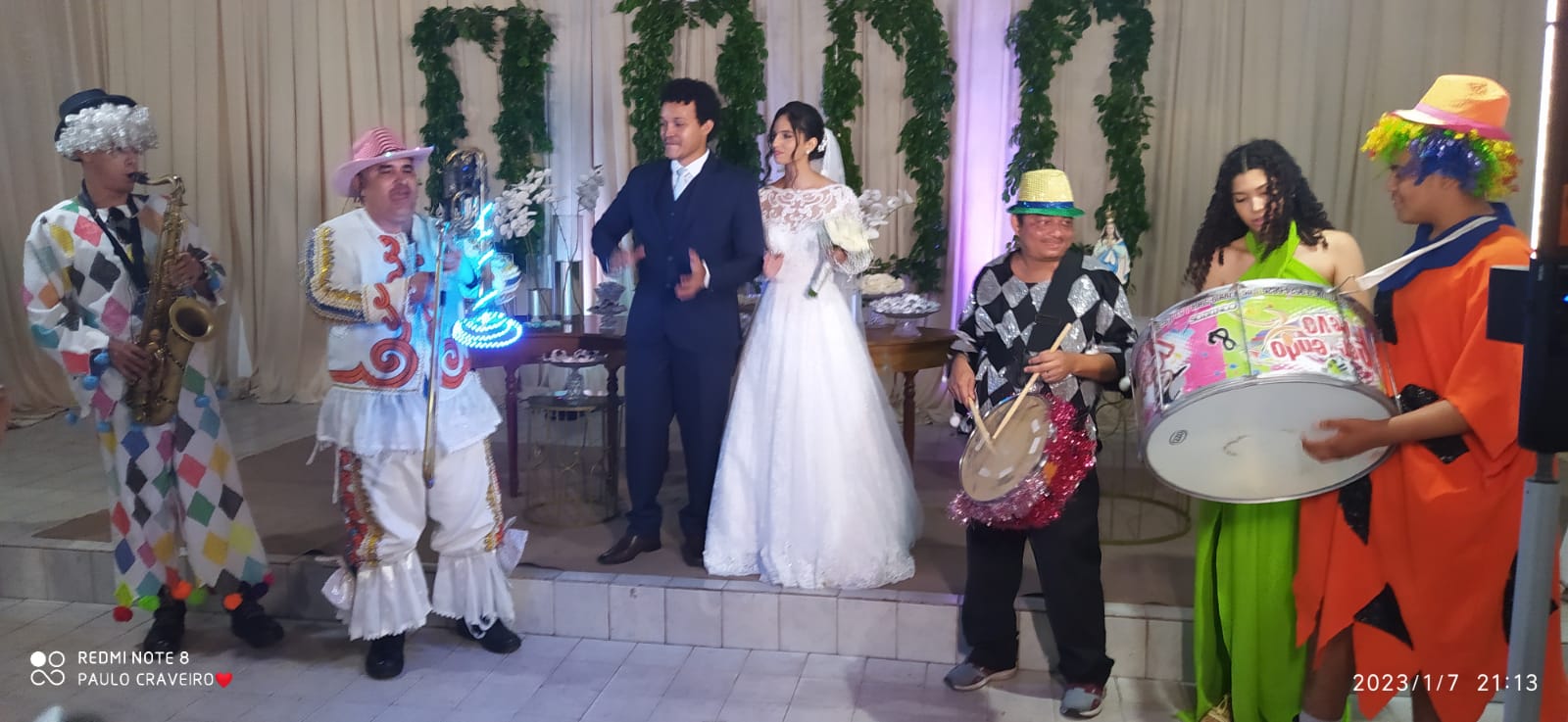 Durante a recepção aconteceu um momento muito emocionante e alegre, quando amigos de Harisson adentraram ao Clube com uma grande animação carnavalesca. O amigo Wando do Sax com seus familiares prestaram uma grande homenagem aos recém-casados. Uma das madrinhas foi quem pegou o buquê jogado pela mais nova esposa da cidade.