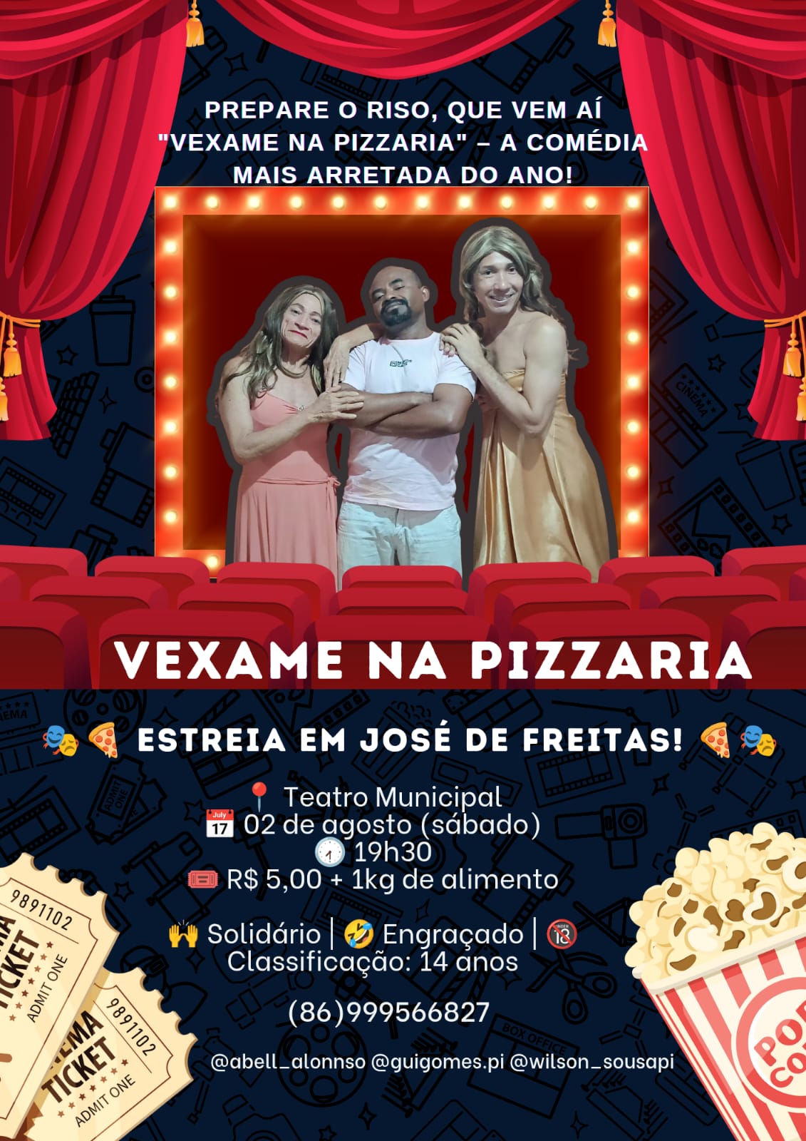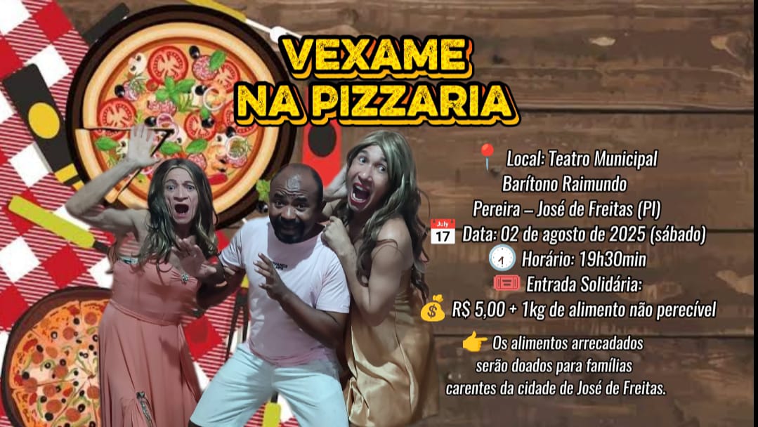 Prepare se para soltar o riso com a Comédia mais louca, “Vexame na Pizzaria”, um evento solidário que acontecerá dia 02 de agosto sábado no Teatro Municipal Barítono Raimundo Pereira, no centro da cidade de José de Freitas.