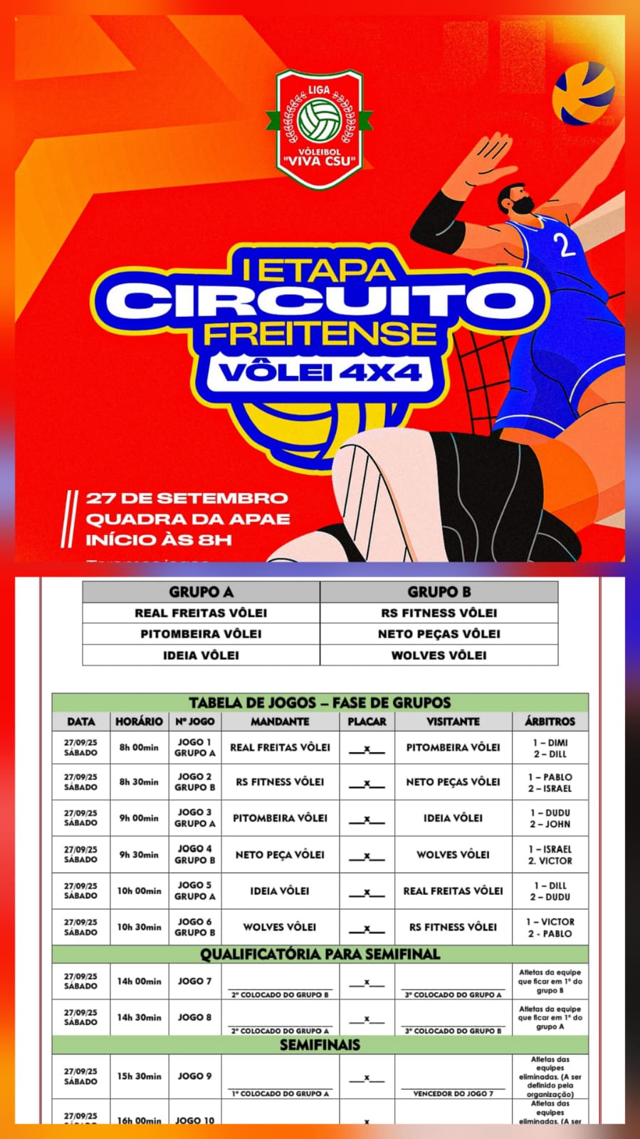 A Liga Vôleibol “Viva CSU”, realizará neste sábado dia 27 de setembro de 2025, (sábado), a I Etapa Circuito Freitense de Vôlei 4X4. O inicio dos jogos está previsto para as 08:00 horas da manhã, com entrada franca.