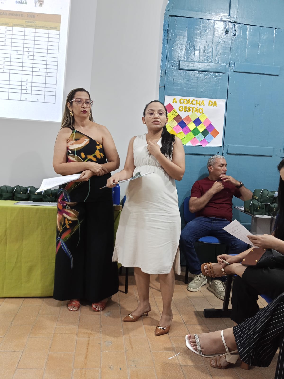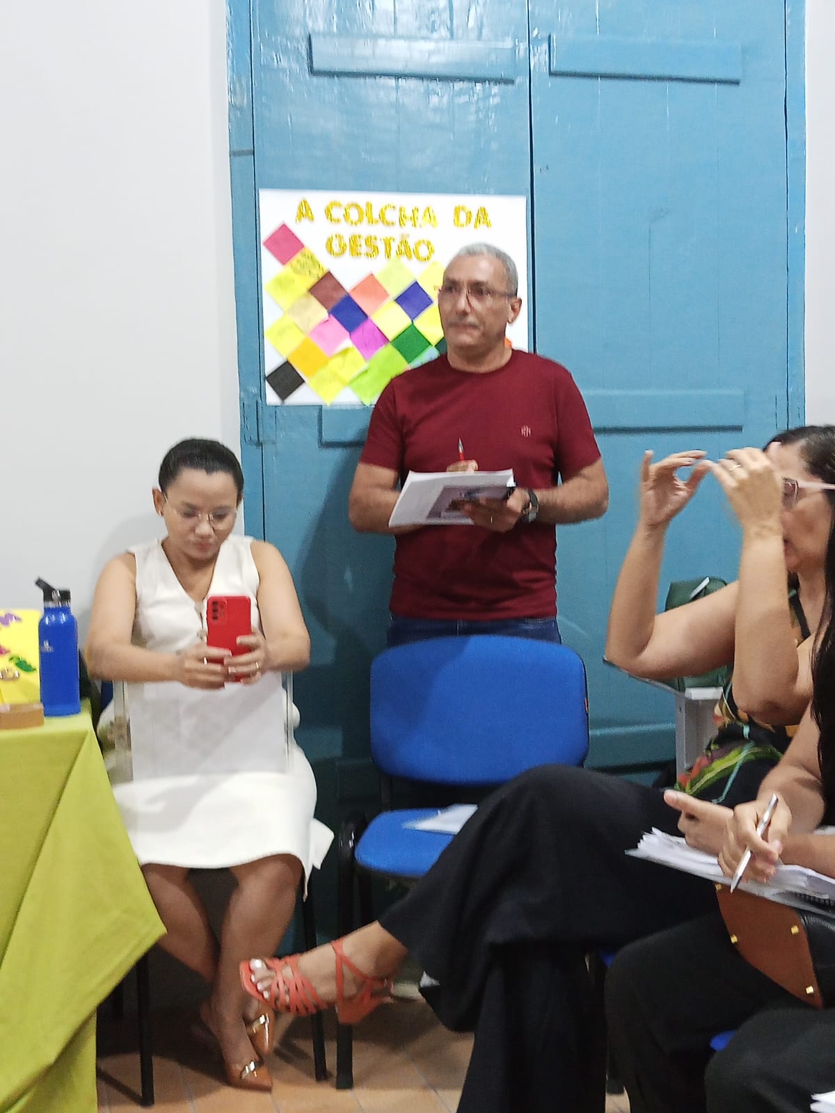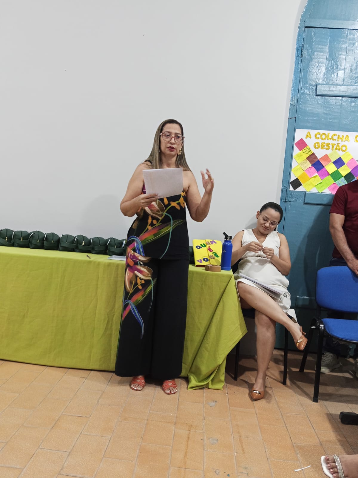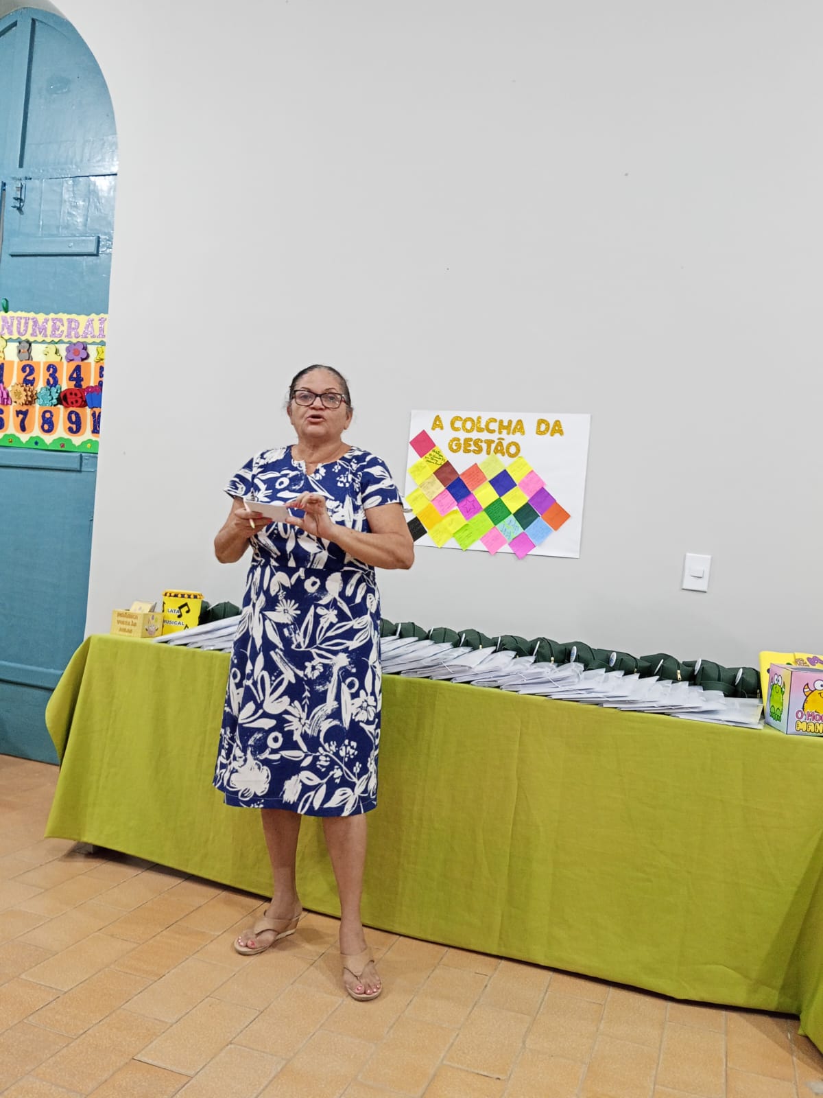 A Professora Socorro Cruz organizou uma dinâmica entre os presentes intitulada “Colcha da Gestão Escolar”, com a participação de coordenadoras e diretora das escolas Engenheiro Vicente Batista, Tia Amélia e Carlota Freitase. Uma oração de boas-vindas aos coordenadores, professores, aos envolvidos em educação.