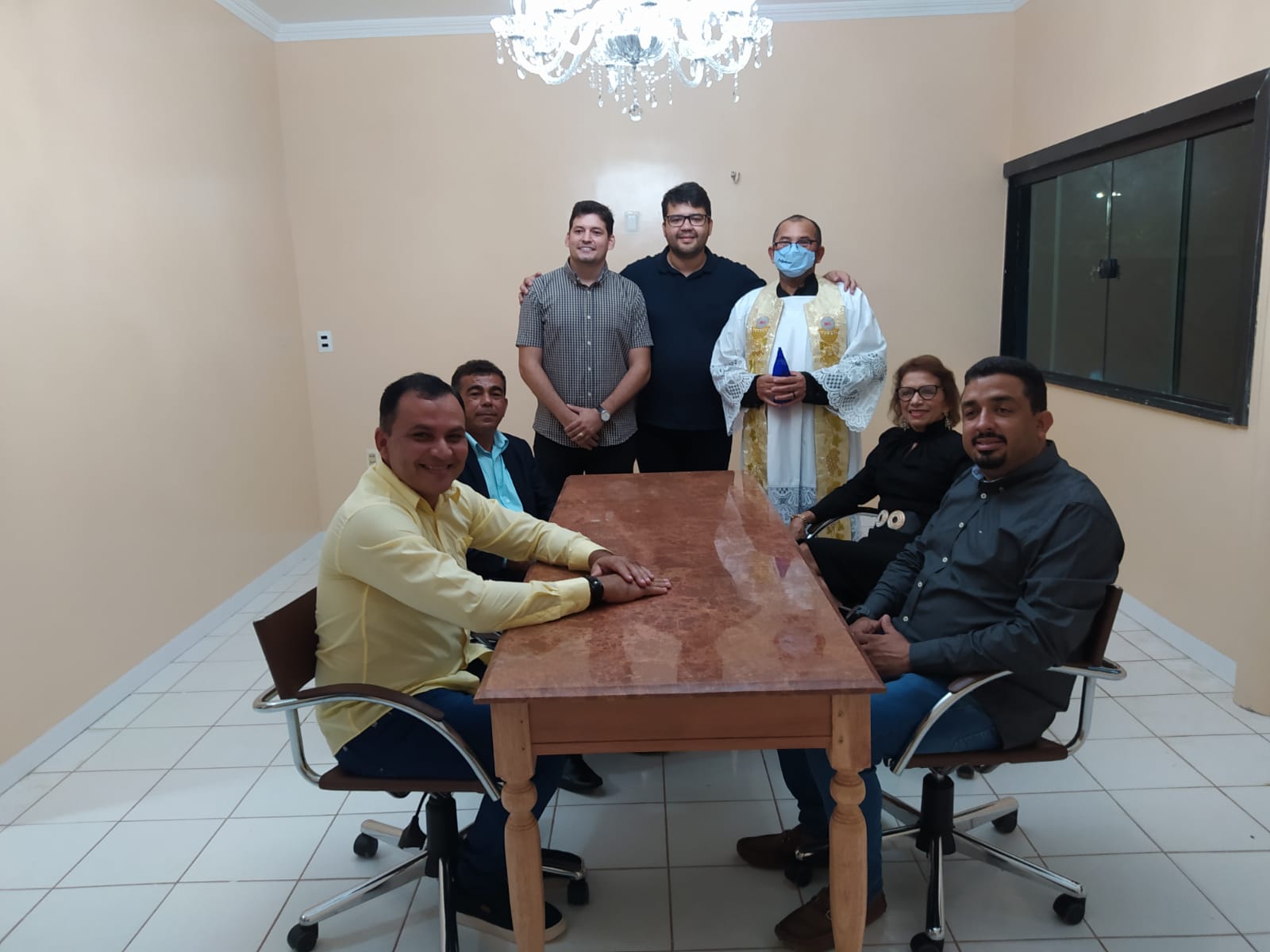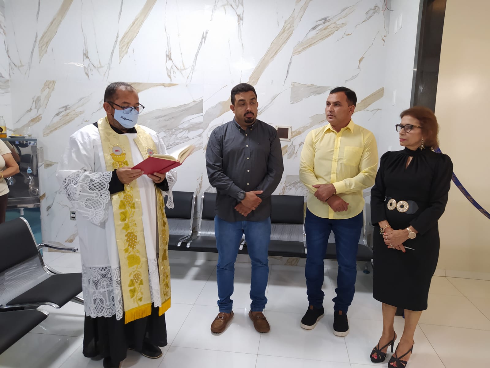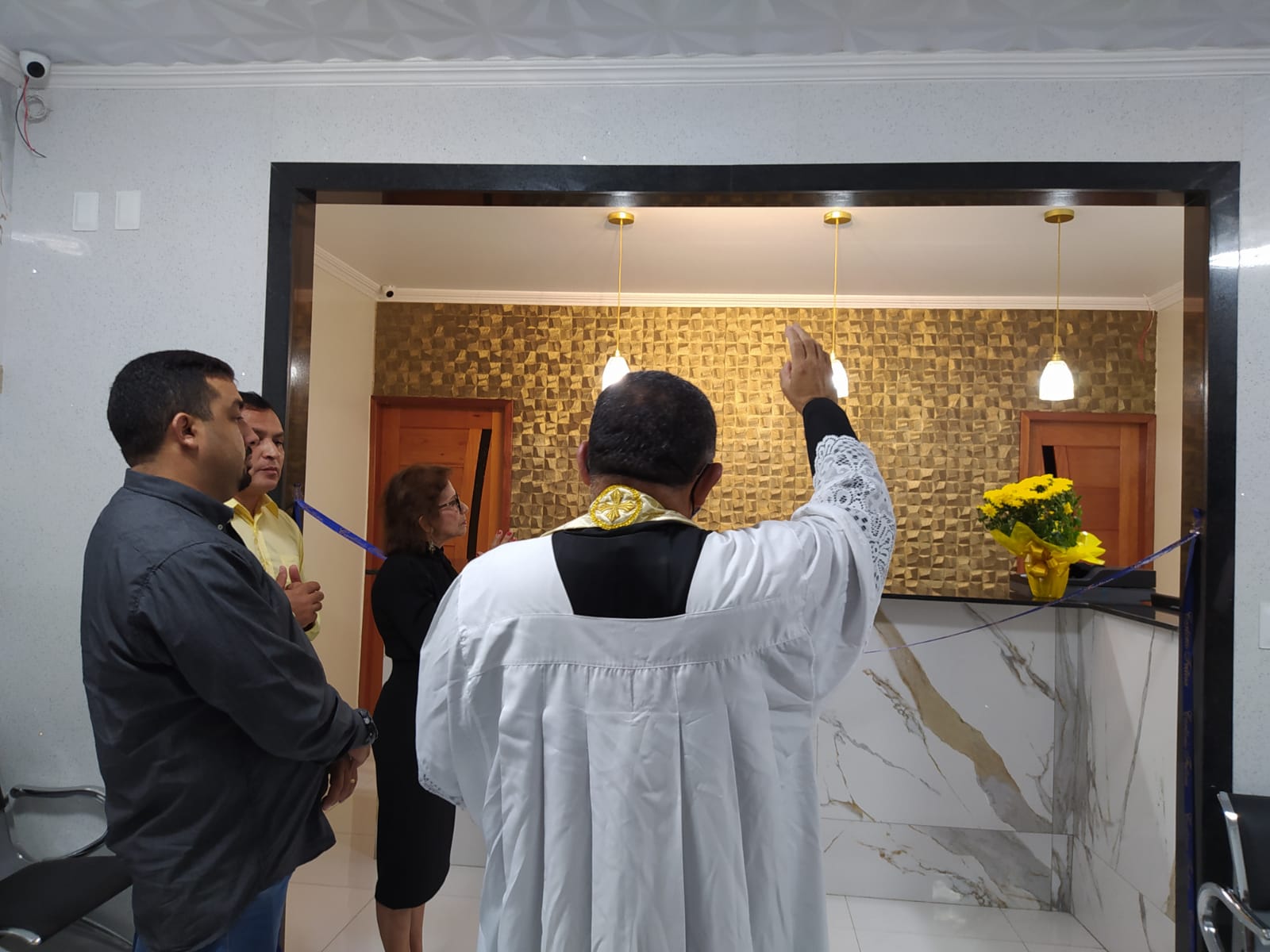 Padre Jerônimo da Pastoral Santo Antônio fez a oração  de abertura e bons negócios para local de trabalho pediu pela saúde e disposição de todos que estarão conduzindo a referida casa. Fez a oração universal, o Pai Nosso com todos os presentes e fez a benção de todos os cômodos das novas instalações do Cartório Feitosa.