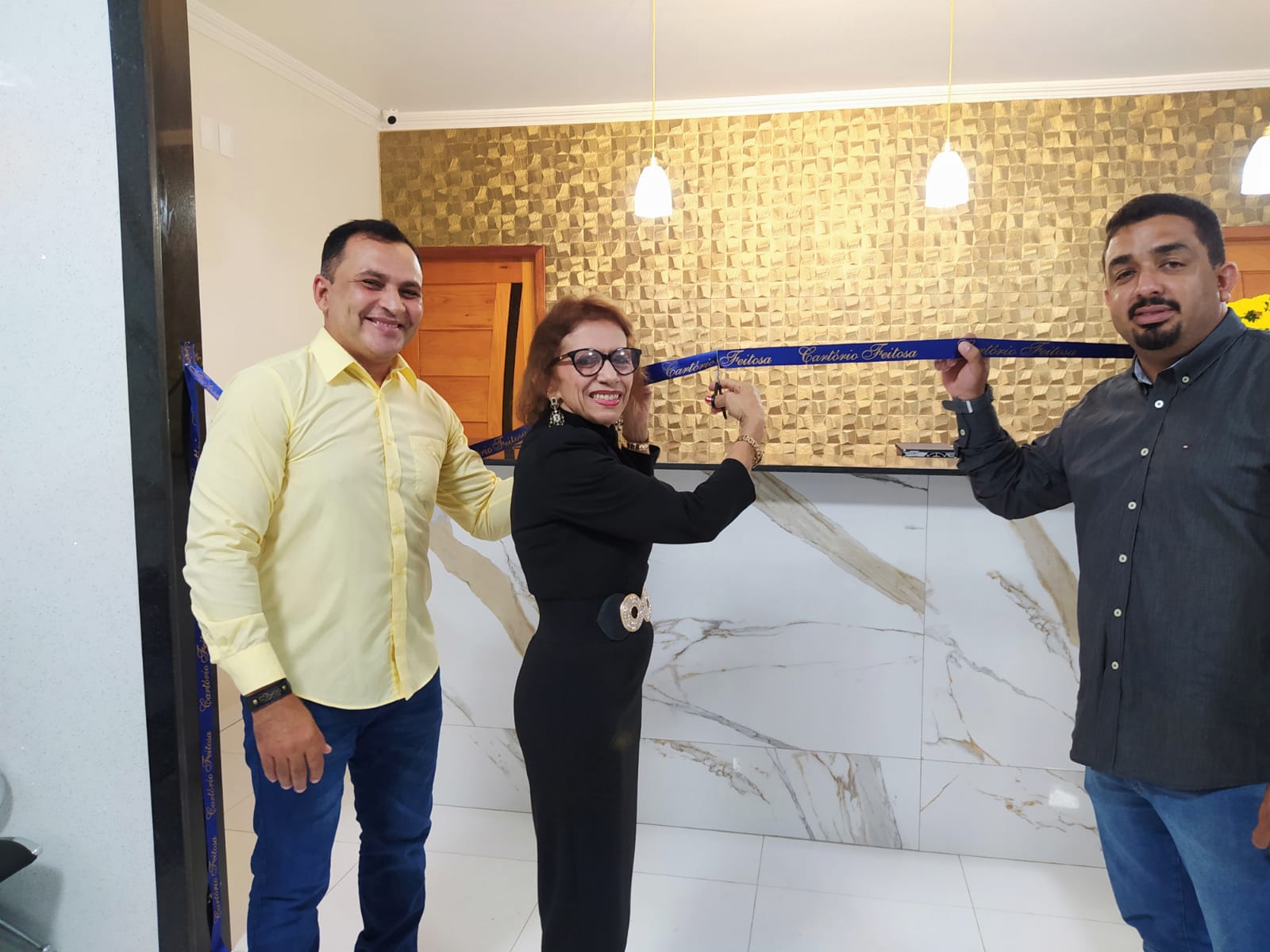 A Tabeliã Dra. Hilda Feitosa ao lado do vice-prefeito Antônio Abreu e do Presidente da Câmara Municipal, Tiago Pinto fizeram o corte da fita. Momento muito importante na inauguração é o ponto de partida ou o começo oficial das novas atividades do Cartório. Após a benção e o corte da fita foram abertas as portas para que os convidados pudessem conhecer as novas Instalações do Cartório Feitosa.