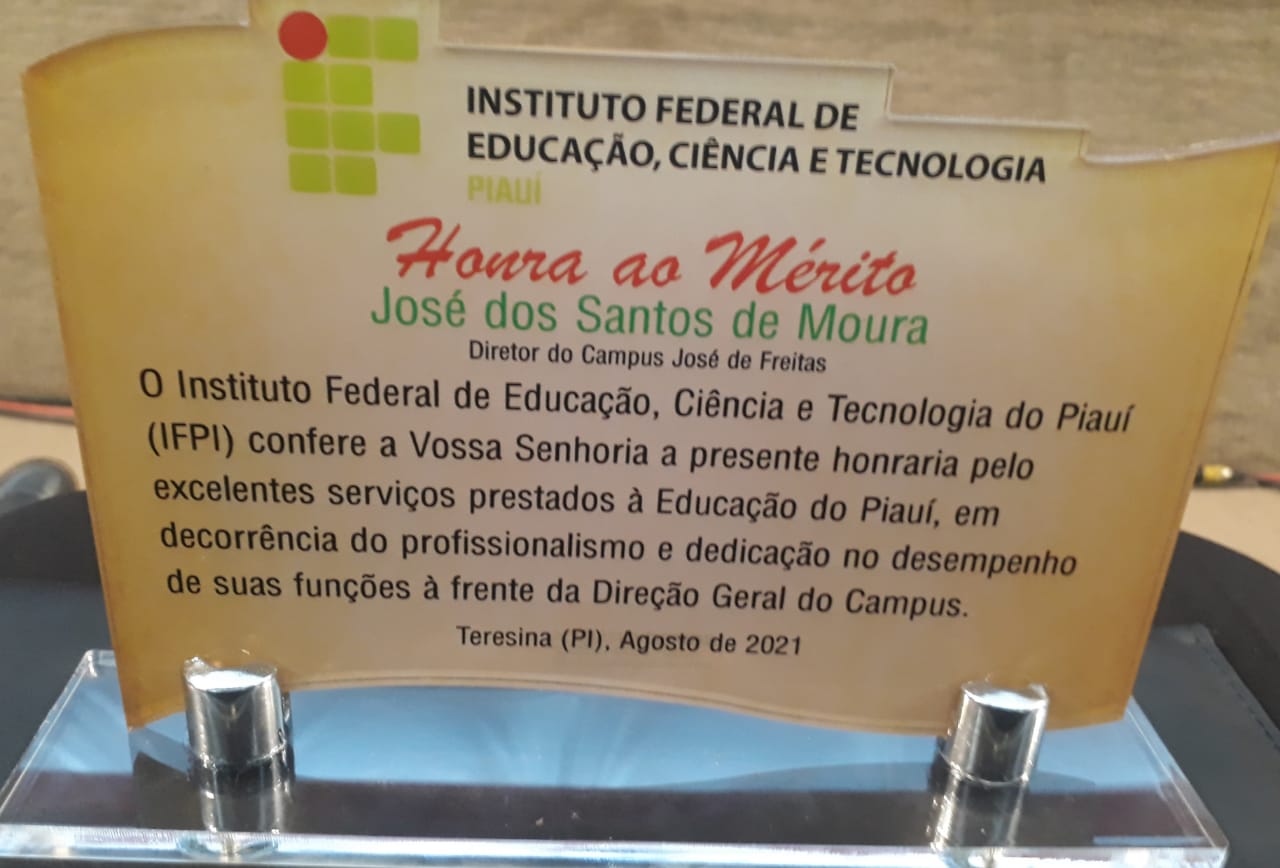 O Professor José dos Santos de Moura assume o IFPI Campus Avançado de José de Freitas para o quatriênio Mandato de 2021 a 2025. A solenidade de posse aconteceu no auditório do IFPI Central Teresina-PI. Professor Santos como é mais conhecido recebeu sua portaria e uma placa de Honra ao Mérito pelos excelentes serviços prestados à Educação do Piauí.