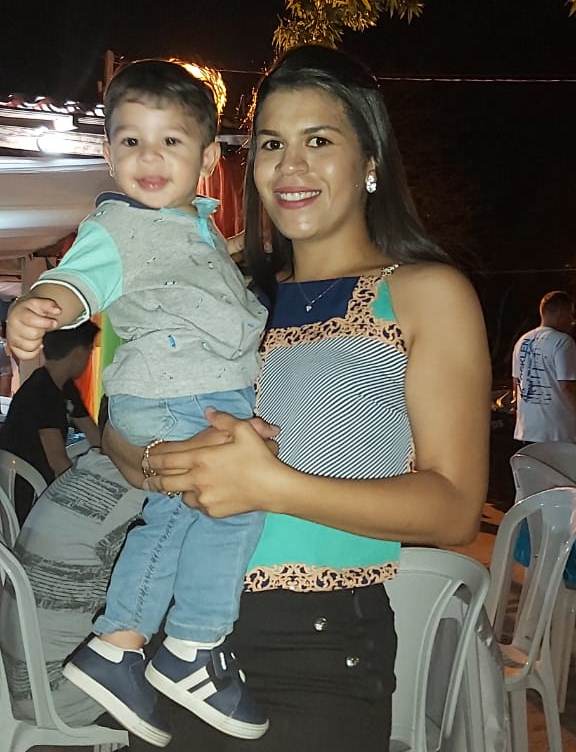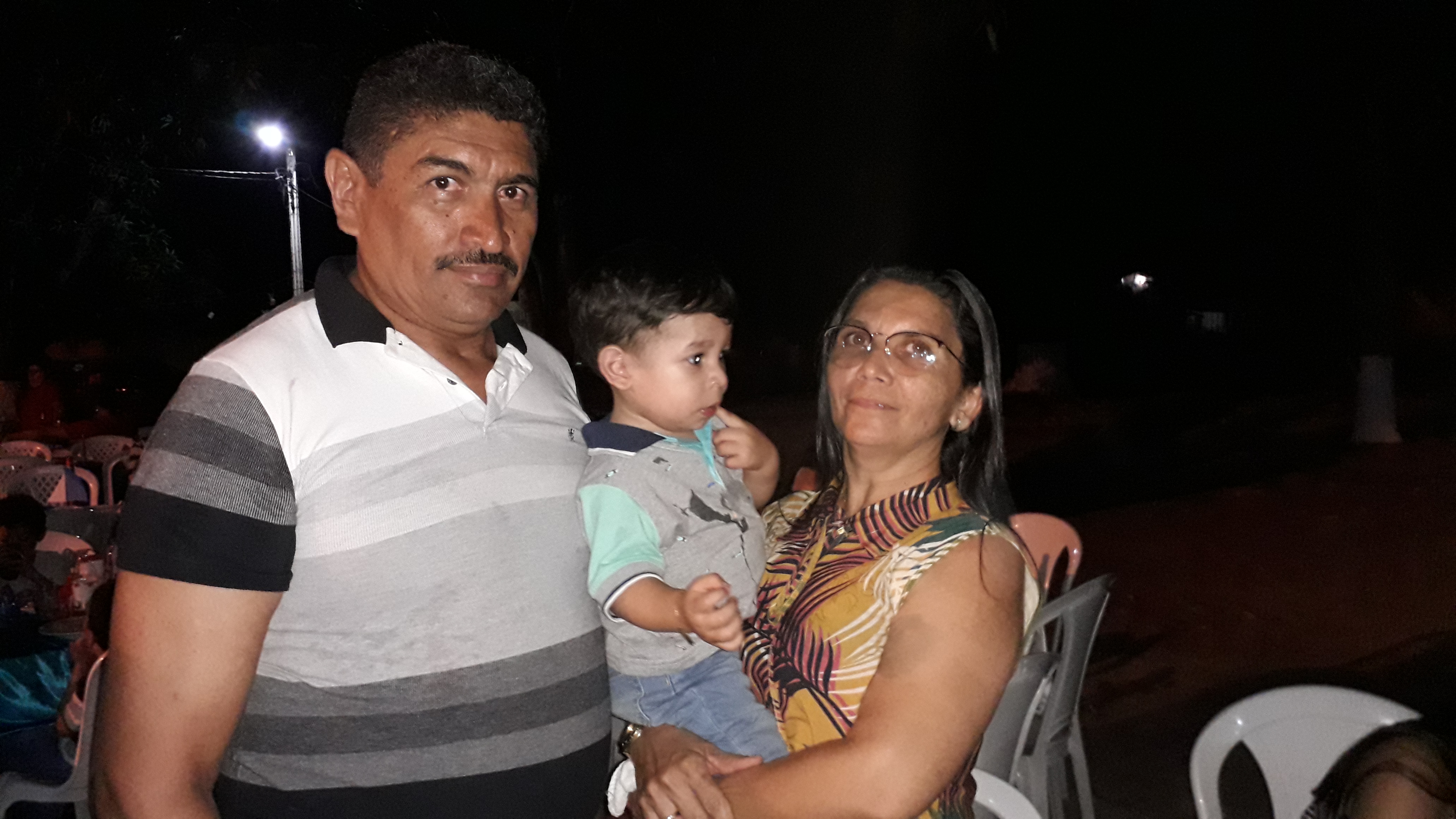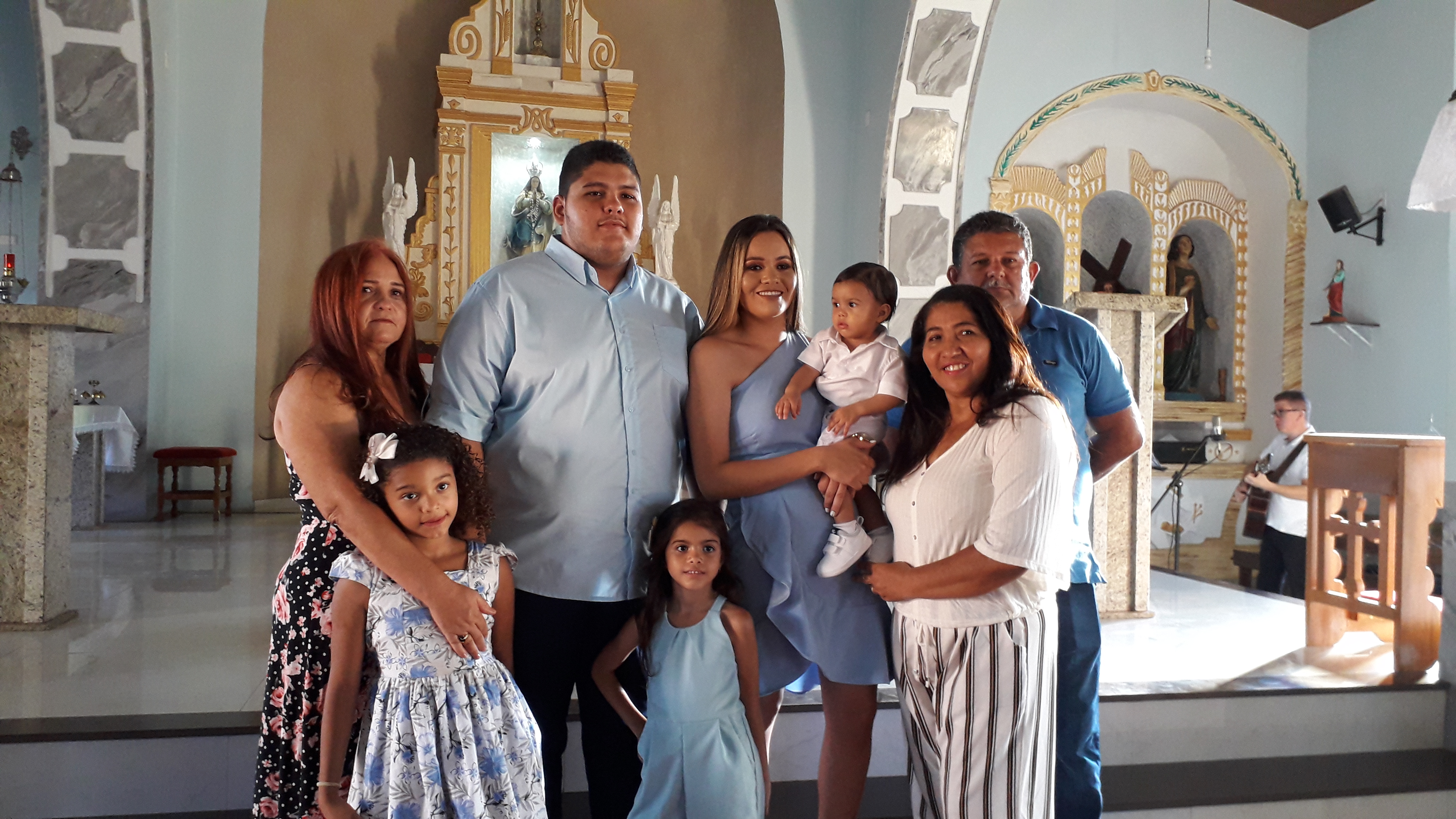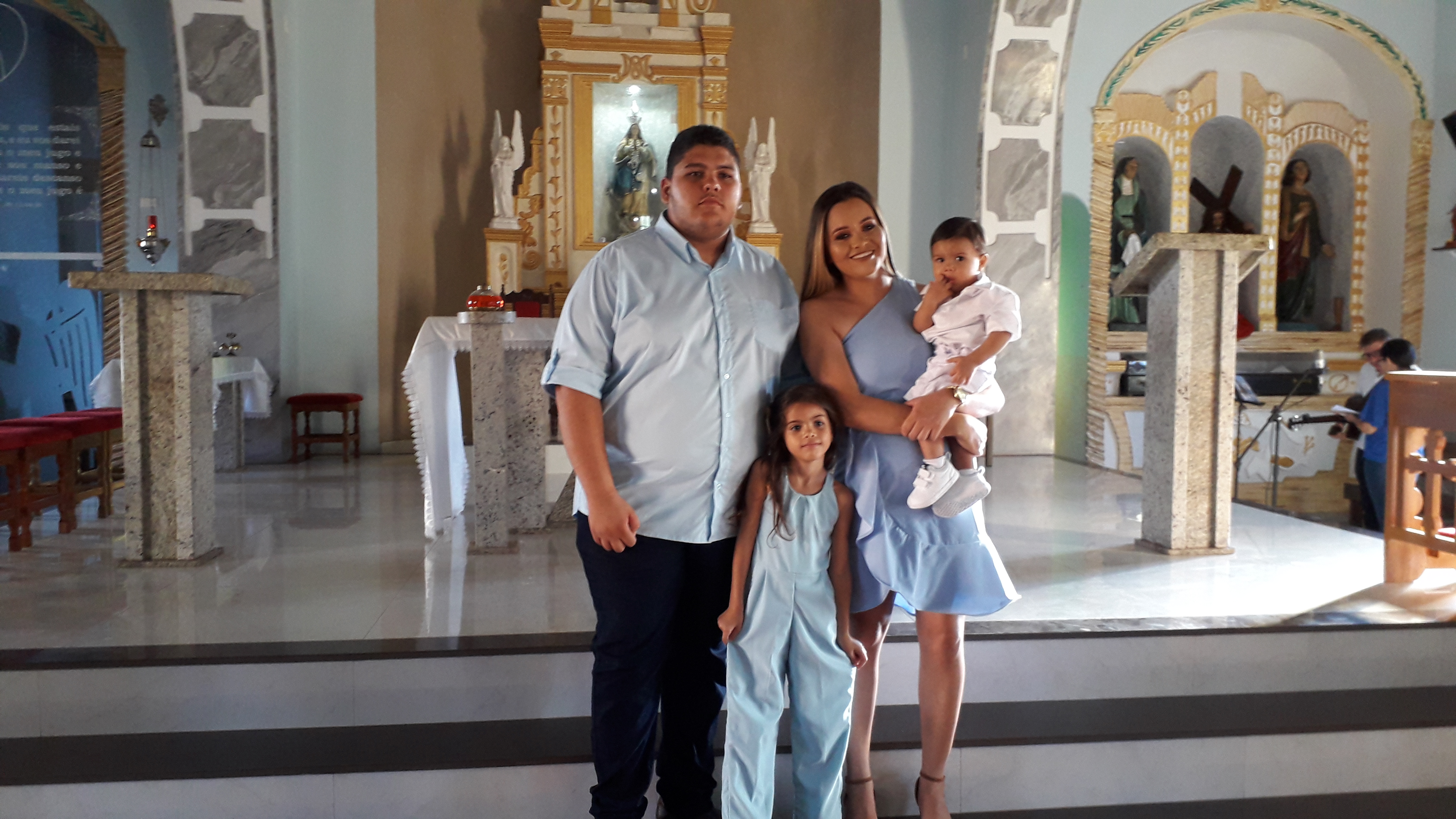 Luiz Benício e seus pais Hudson Veras de Sampaio Almendra Neto e Joyce Santos de Araujo, no sacramento do Batismo.