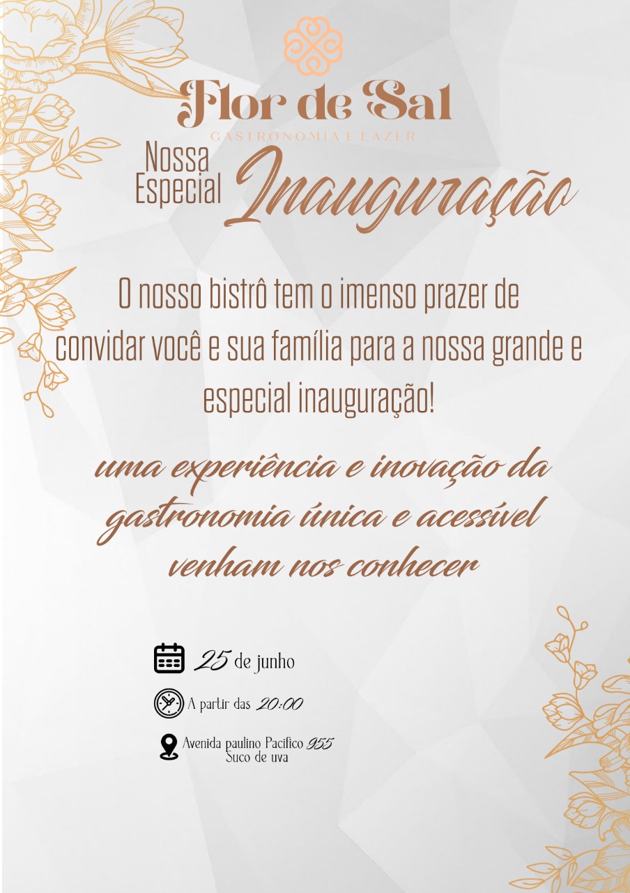 Todos que fazem o Bistrô Flor de Sal Gastronomia e Lazer, em nome da proprietária Márcia Martin têm a honra de convidar você e sua família para a grande e especial inauguração.
