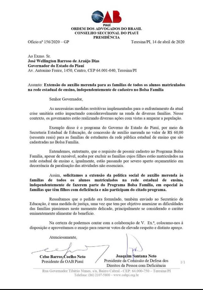 A OAB Piauí solicita ainda que o auxílio da merenda, no valor de R$ 60,00, seja destinado às famílias de todos os alunos matriculados na rede estadual, independente de fazerem parte do Programa Bolsa Família.