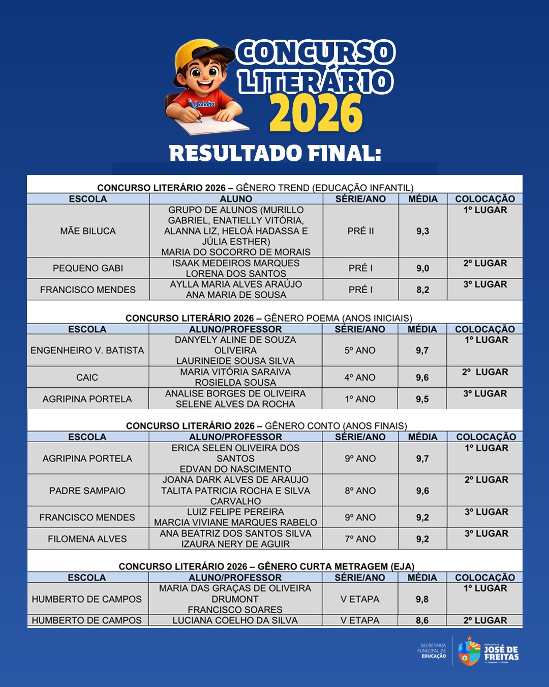 A Prefeitura de José de Freitas, por meio da Secretaria Municipal de Educação, realizou nesta sexta-feira, 17 de abril de 2026, a solenidade de entrega da premiação do Concurso Literário 2026, que teve como tema “Entre Rios e Letras: Narrativas do Nosso Lugar”.