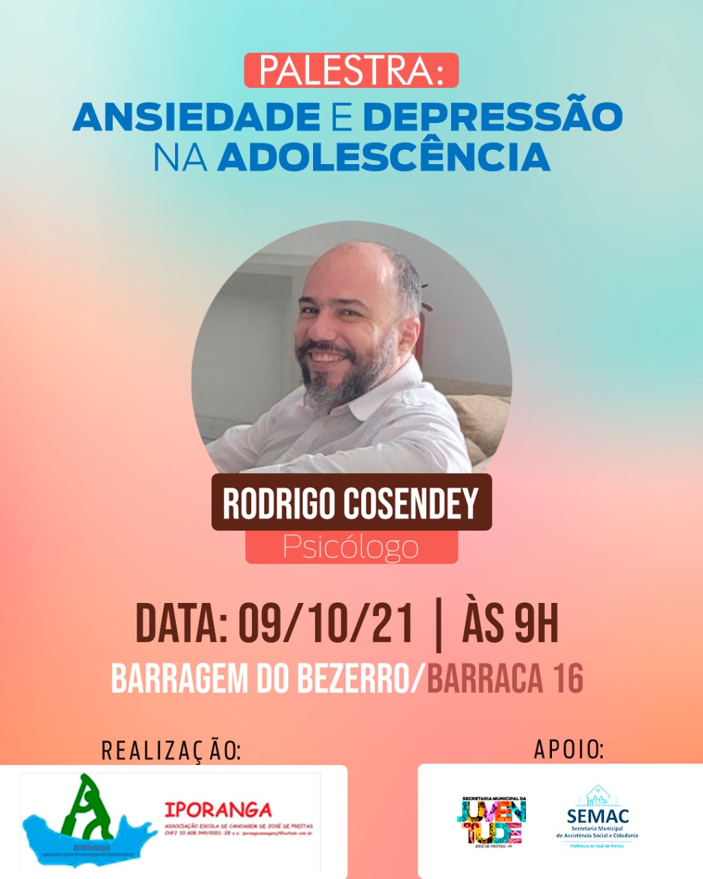 O Projeto Canoagem Iporanga, que tem à frente o Promotor de Justiça Flavio Teixeira, que trabalha com jovens adolescentes e procurando entender e sentir as emoções dos jovens que fazem parte do projeto, convidou o Psicólogo Rodrigo Cosendey para proferir uma palestra com o tema:”Ansiedade e Depressão na Adolescência”.A palestra foi mais direcionada aos pais e alunos do PROJETO IPORANGA. Uma forma dos pais passarem a entender as mudanças de comportamento de seus filhos e que procure acompanhar e entender essas mudanças.