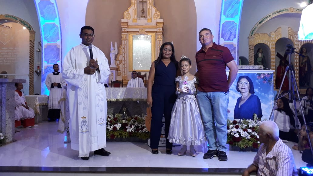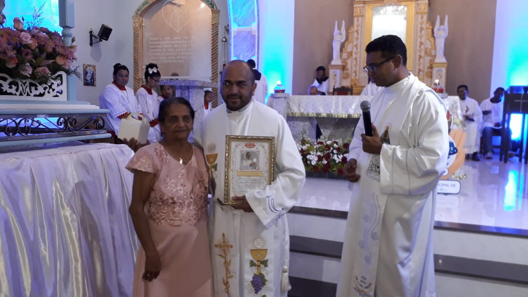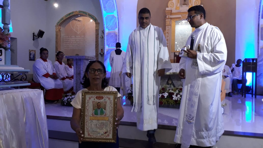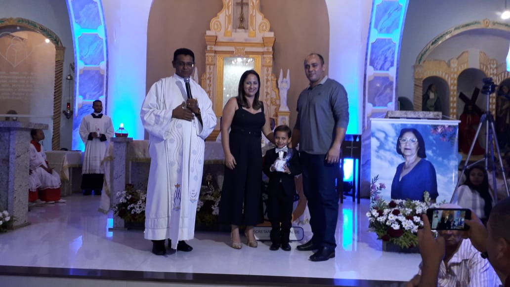 A homenagem póstuma foi para Maria da Conceição Morais Farias, os familiares compareceram e receberam uma lembrança das mãos do Padre Gilcimar.