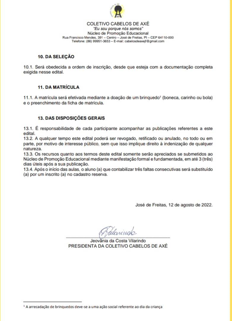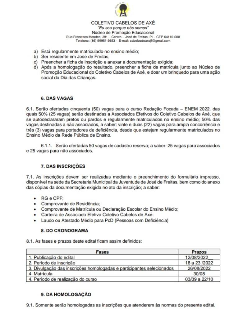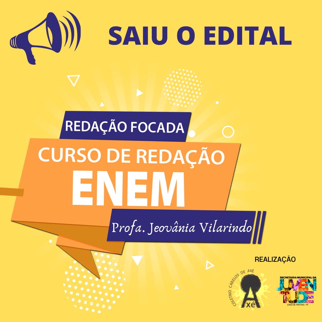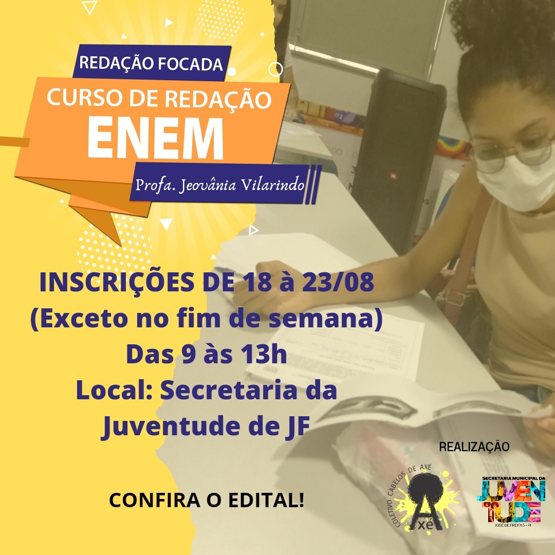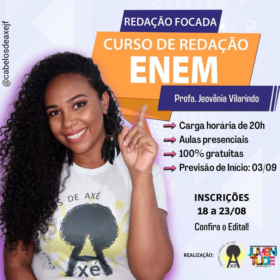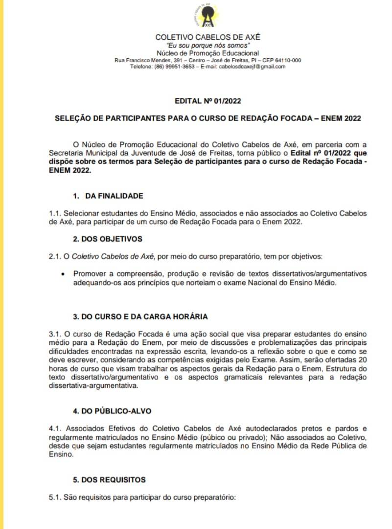 O Núcleo de Promoção Educacional do Coletivo Cabelos de Axé, em parceria com a Secretaria Municipal da Juventude de José de Freitas, torna público o Edital nº 01/2022 que dispõe sobre os termos para Seleção de participantes para o curso de Redação Focada – ENEM 2022. As aulas acontecem aos sábados, das 9 às 11 h no CETI- Antônio Freitas, com material incluso.