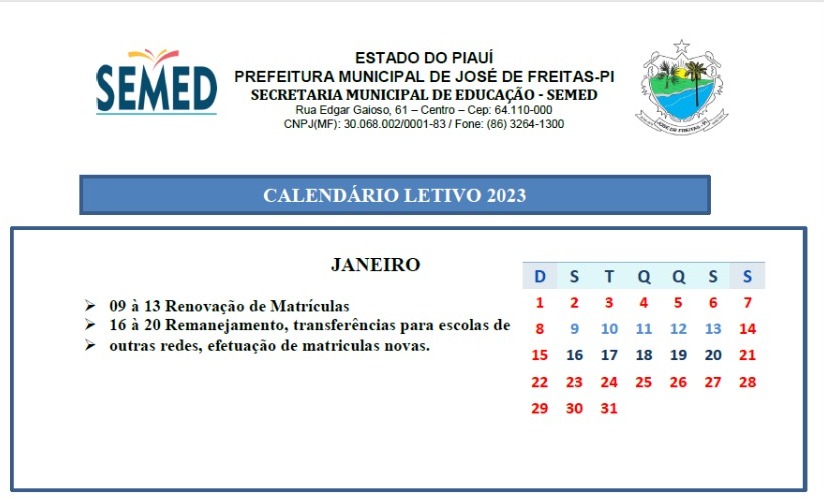 Secretaria de Educação de José de Freitas Lança Calendário Letivo Escolar 2023