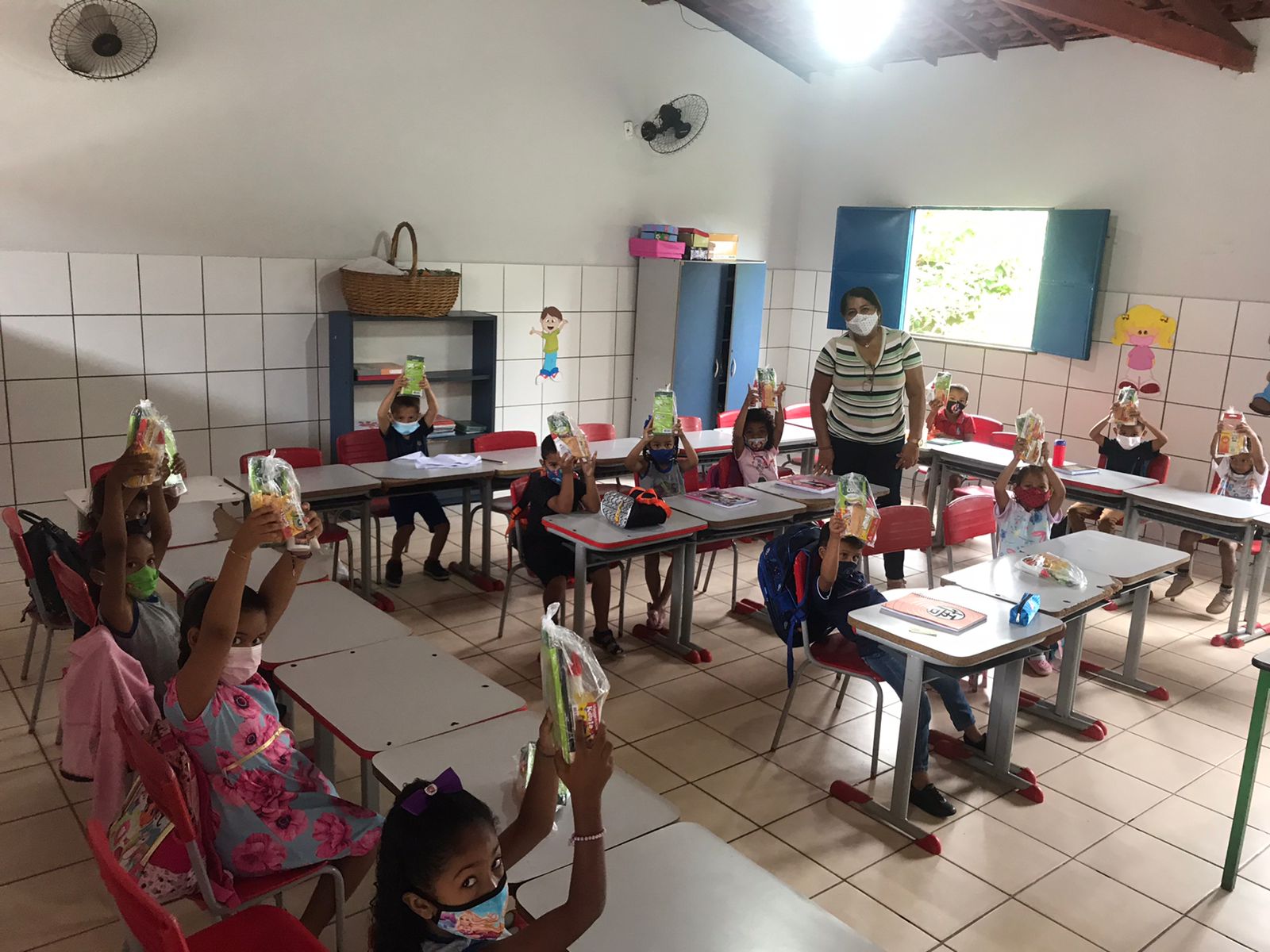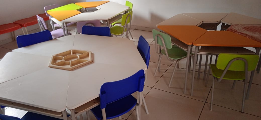 As escolas todas organizadas, com salas adequadas para o retorno das aulas presenciais. Os alunos receberam um kit escolar e garrafas para o uso de sua água individual.