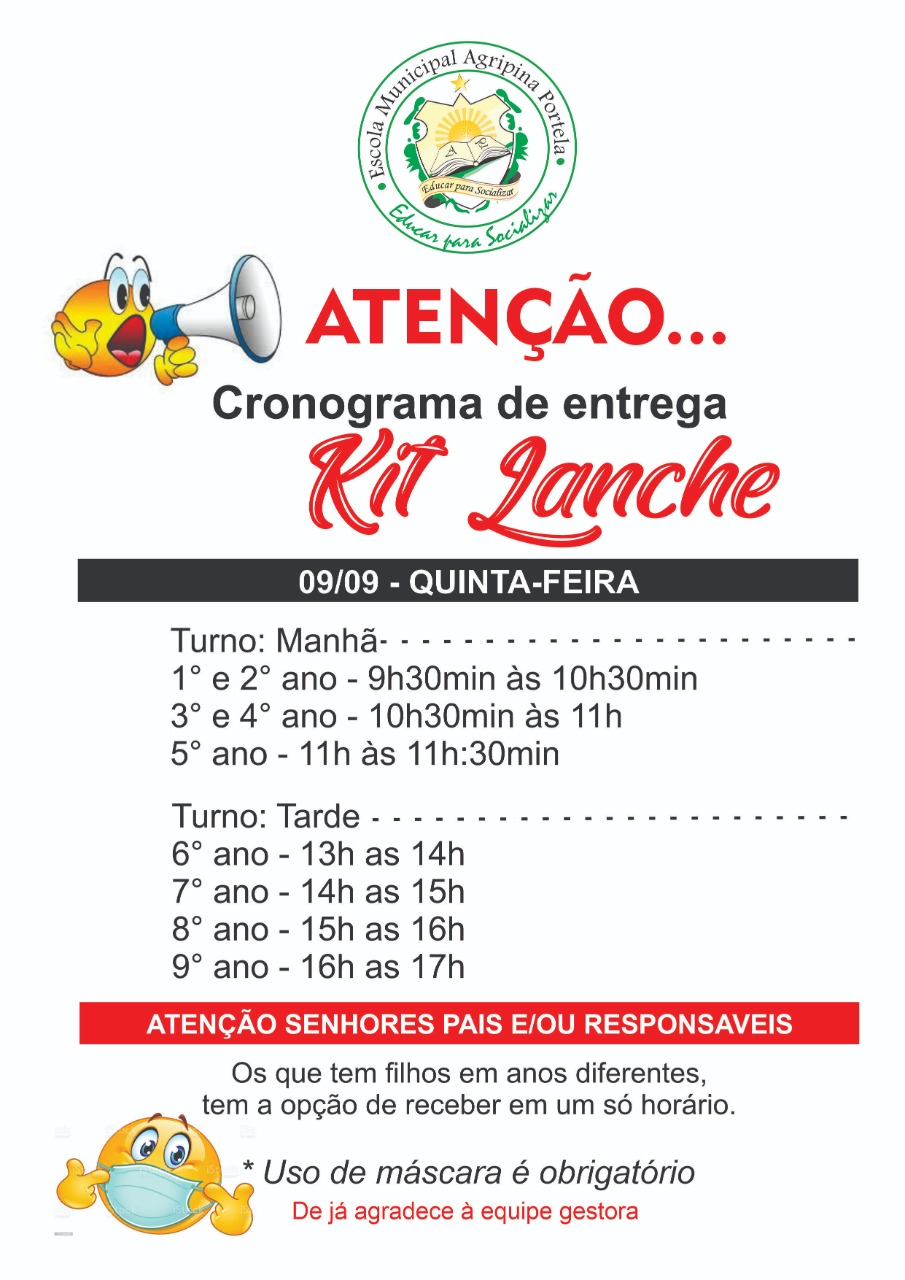 As Escolas obedecerão os seguintes horários para entrega do Kit.