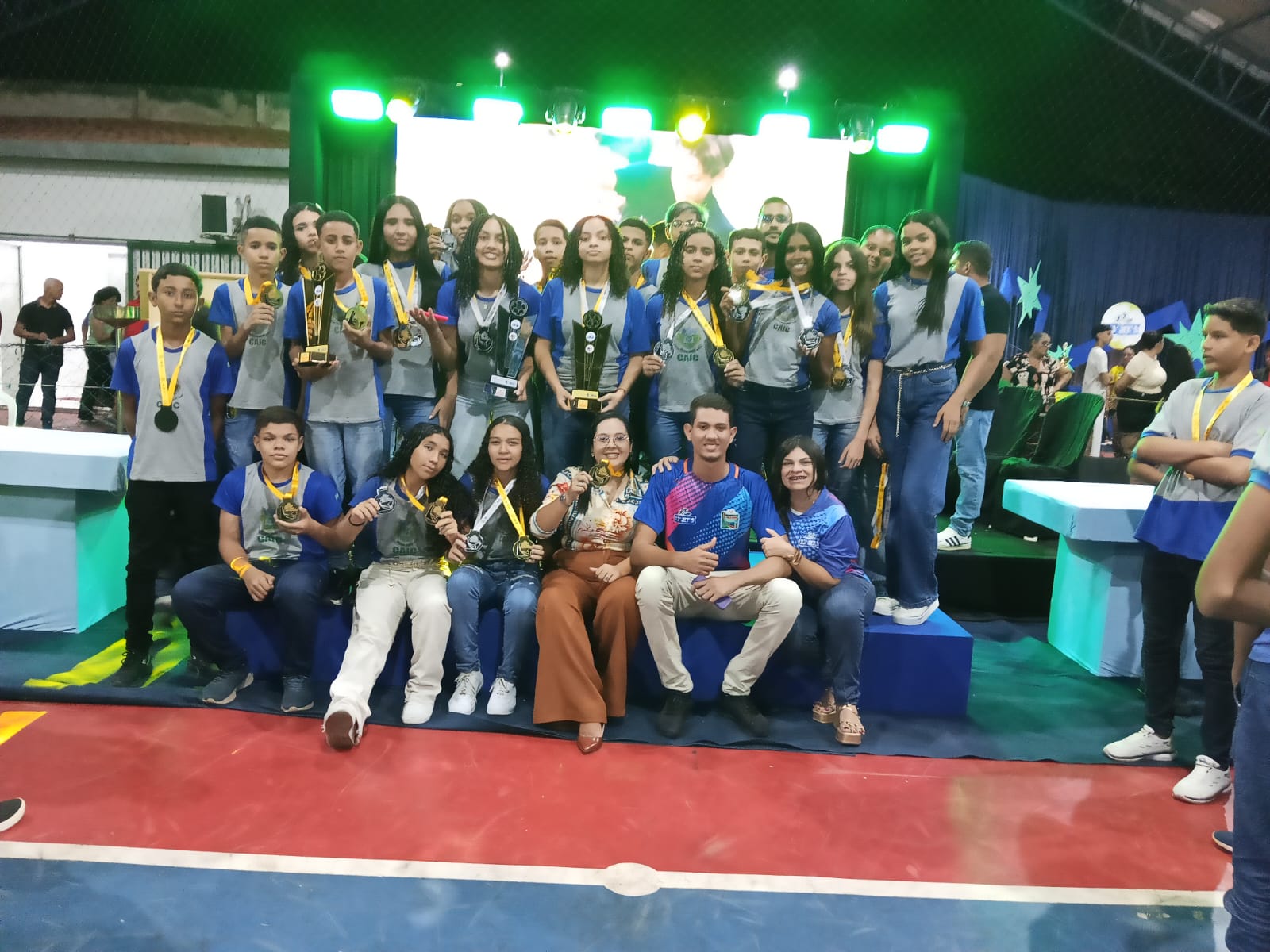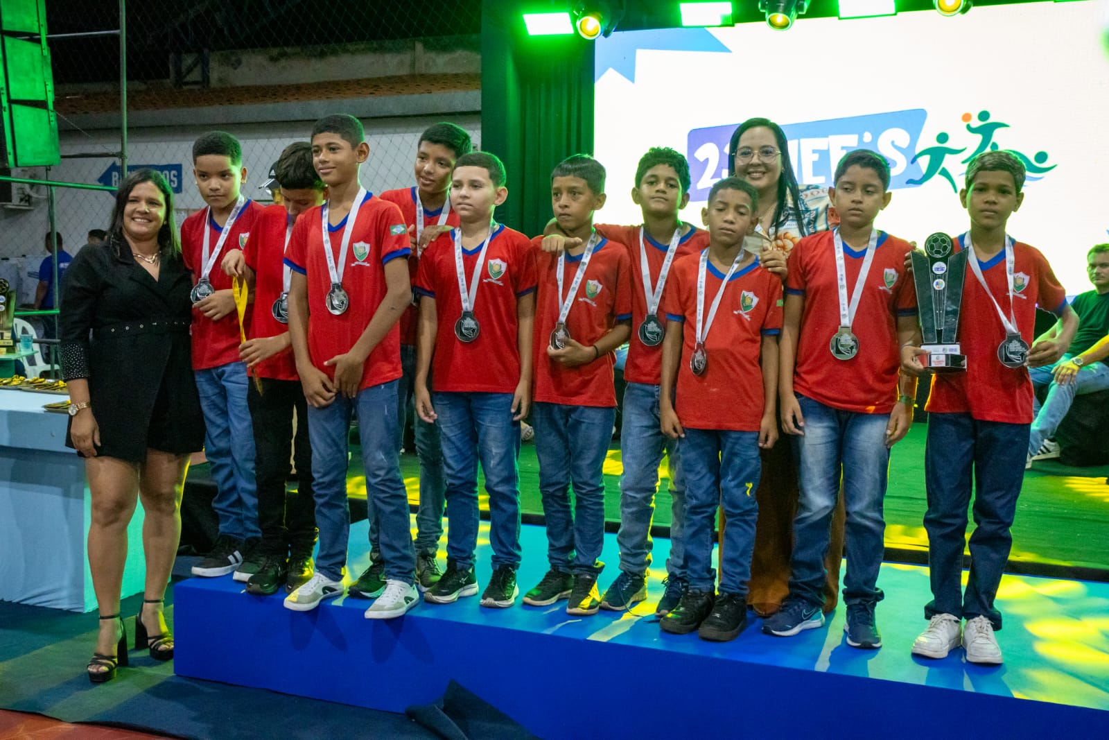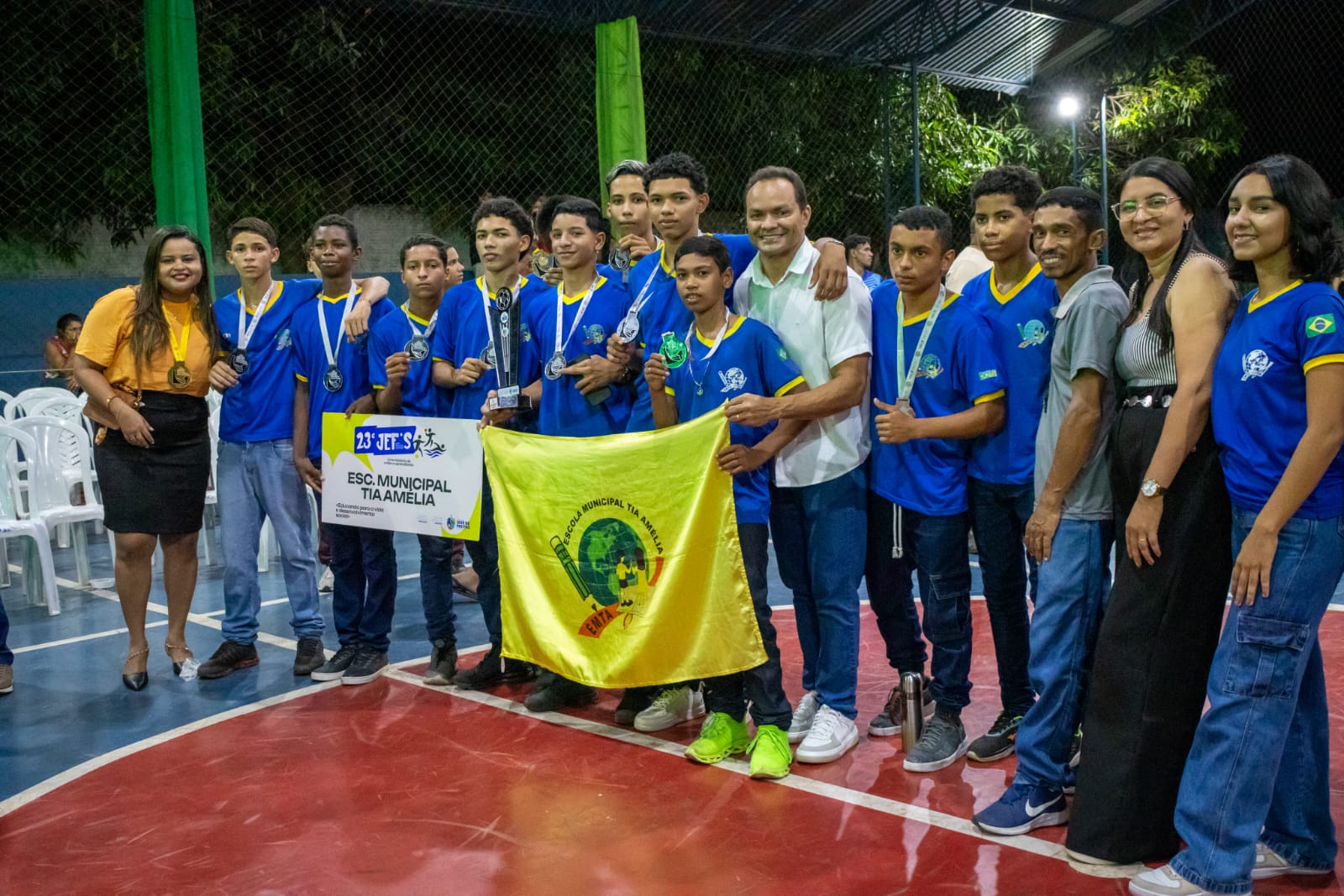 O organizador do evento, Edmilson Saraiva, juntamente com sua equipe e autoridades presentes, realizou a entrega dos troféus e medalhas às escolas e atletas vencedores, coroando o esforço, a dedicação e o espírito esportivo demonstrados ao longo das competições.