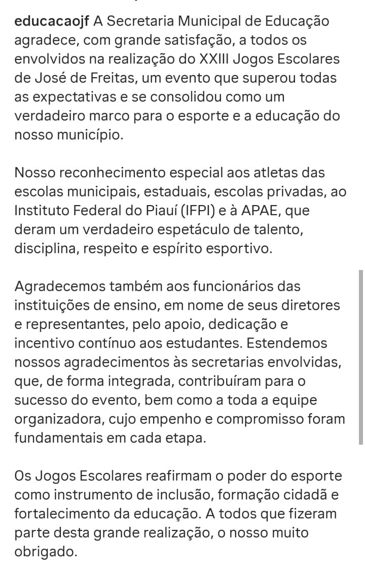 O Secretário de Educação, Professor Rummenigge Rocha, em nome da Secretaria Municipal de Educação-SEMED, expediu um texto de agradecimento, na rede social da educação a todos que contribuíram com a realização do XXIII Jogos Escolares de José de Freitas-2025.
