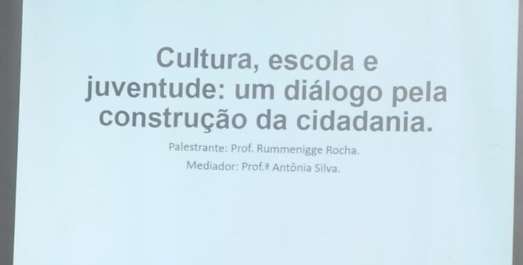 Professor e Secretário de Educação Rummenigge Rocha, apresentou a palestra: Cultura, Escola e Juventude: Um Diálogo pela Construção da Cidadania e teve como mediadora a Professora Antônia Silva.